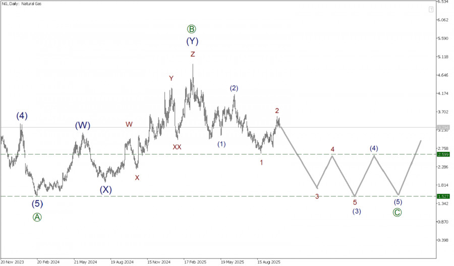 FxSignal 9-10-2025, 18:24 27 Аналитика, прогнозы валютного рынкаГлядя на текущий график, можно заметить, что по газу может формироваться крупный коррекционный тренд. На текущем графике представлена разметка большой действующей волны (Y), принимающей форму тройного зигзага W-X-Y-XX-Z. На текущем графике мы видим, что действующая волна Z похожа на стандартный зигзаг, внутри которого завершен импульс [A]. Сейчас может формироваться коррекционная подволна [B], которая, судя по всему, принимает форму двойного зигзага (W)-(X)-(Y). Предполагается, что на сегодняшний день завершена только первая действующая волан (W), она приняла форму двойного зигзага W-X-Y. Сейчас в процессе развития может находиться противодействующая волна связка (X), она тоже представляет собой двойной зигзаг W-X-Y. На последнем участке графика может формироваться финальная зигзагообразная волна Y. Внутри волны Y могла подойти к концу коррекционная подволна [B], поэтому в ближайшее время участников рынка может ждать разворот цены и начало падения в импульсе [C]. Вполне возможно, что быки поведут рынок за собой в сторону уровня 1.52. На указанной отметке ранее была завершена подволна [A]. В текущей ситуации можно рассматривать открытие коротких позиций. Торговые рекомендации: Sell 3.29, takeprofit 2.59.