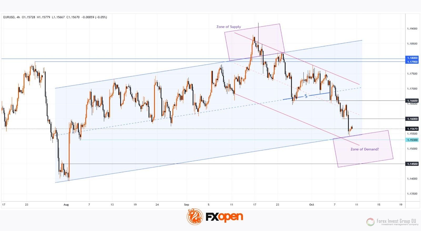 Действительно, после пробоя уровня 1.16600, нисходящая динамика продолжилась. Как может развиваться ситуация далее? Для этого мы расширили восходящий канал, чтобы предположить гипотезу, согласно которой в середине сентября цена поднялась в зону предложений (отмечена фиолетовым цветом) над предыдущей вершиной в районе уровня 1.1790 и психологической отметкой 1.1800. Другими словами, Умные деньги формировали медвежью позицию, как описывает паттерн Liquidity Sweep.