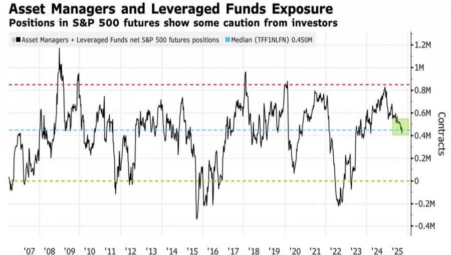 Широкий фондовый индекс может перейти к консолидации на фоне усталости, но вряд ли откат окажется глубоким. Truist отмечает, что с 1957 текущий «бычий» рынок является 11-м в истории. От уровней минимумов октября 2022 S&P 500 вырос на 90%. Это ниже медианного значения показателя, имевшего место во время предыдущих трендов. При этом 7 из 10 восходящих тенденций длились более трех лет. Таким образом, S&P 500 есть куда расти. Тем более что позиционирование спекулянтов, хедж-фондов и управляющих активами далеко от экстремальных уровней. Динамика спекулятивных позиций по S&P 500