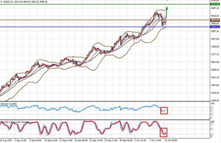 USD/JPY Пара нашла сопротивление на уровне 153.00, Неспособность его преодолеть может привести к ее коррекционному падению к 150.45. Уровнем для ее продажи может служить отметка 152.35 после снижения цены ниже поддержки 152.40. GOLD Цена на золото повышается после локальной коррекции вниз. Сохранение ряда негативных факторов геополитического характера будет поддерживать котировки золота. Уровнем для его покупки может служить отметка 3994.00.Материал предоставлен компанией InstaForex - www.instaforex.com