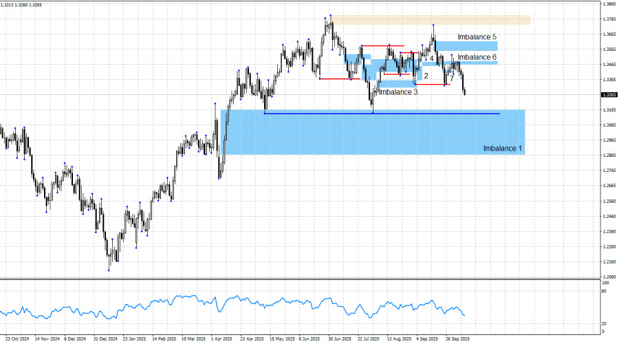 Вчера состоялось выступление президента FOMC Джерома Пауэлла, в котором каждый мог найти то, что нравится ему. В данное время атакуют медведи, а растет доллар. Поэтому трейдеры рассмотрели в речи Пауэлла «ястребиные» намеки или же отсутствие «голубиных», что и помогло доллару США. Большинство трейдеров считает, что FOMC примет решение провести смягчение ДКП и в октябре, и в декабре. А Пауэлл не подтвердил эти ожидания, сообщив, что все будет зависеть от экономических данных. Так как экономические данные «на паузе», рынок мог посчитать, что ФРС оставит процентную ставку без изменений в конце месяца. На мой взгляд, подобное объяснение не выдерживает никакой критики, но и падение британского фунта на этой неделе вызывает у меня множество вопросов. Доллар растет каждый день при том, что никаких позитивных новостей из США не поступает. А в Великобритании на этой неделе календарь событий пустой. Ситуация практически парадоксальная. Графический анализ показывает реакцию цены на «медвежий» имбаланс 6. Однако для дальнейшего падения котировок нужен информационный фон, которого пока нет. За последние недели медведи, кажется, использовали все доступные им факторы, но всему рано или поздно приходит конец. Чем ниже проседает курс британской валюты, тем выгоднее быкам открывать новые сделки на покупку. В ближайшее время с последнего свинга может быть произведен еще один съем ликвидности. «Бычьих» паттернов в данное время нет, поэтому возобновление роста (потенциальное) будет достаточно тяжело отработать мгновенно. За последние две недели образовалось три «медвежьих» имбаланса, два из которых были отработаны или инвалидированы. Имбаланс 6 предоставлял возможность открывать сделки на продажу, но напоминаю, что тренд по британцу остается «бычьим». Таким образом, приоритетными являются покупки, а «медвежьи» паттерны я бы не стал рассматривать, так как в новый «медвежий» тренд я начну верить, только когда текущая структура тренда станет противоположной. «Медвежий» ордер-блок остается важным паттерном. Реакция на этот паттерн последовала, но я не ждал и не жду большего, чем коррекционный откат. Коррекционный откат затягивается. На этой неделе информационный фон фактически отсутствовал, но медведи атаковали достаточно уверенно. Реакция на ордер-блок – это сильный сигнал, но в то же время информационный фон для доллара в 2025 году крайне редко бывает благоприятным. Давление Дональда Трампа на ФРС, фиктивные увольнения чиновников, вечная критика Джерома Пауэлла, продолжающая торговая война, а теперь еще и шатдаун – это те факторы, которые не позволяют мне прогнозировать рост доллара. Трейдеры в данное время закрывают глаза на многий негатив для доллара, но на длинной дистанции принимают верные решения. В общем и целом, могу сказать следующее. В «медвежий» тренд по британцу я не верю точно также, как в «медвежий» тренд по европейцу. Слишком много факторов риска скопила американская валюта. Текущий «бычий» тренд можно будет считать завершенным лишь ниже двух лоу (от 12 мая и 1 августа). Эти лоу практически совпадают. Только ниже них произойдет слом «бычьей» структуры. Однако для меня очевидна простая истина – без информационной поддержки любое «медвежье» начинание имеет крайне низкие шансы на полноценную реализацию. Сколько еще будет падать GBP/US