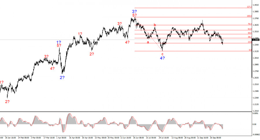 По инструменту GBP/USD волновая разметка продолжает свидетельствовать о построении повышательной структуры волн, но за последние несколько недель она приняла сложный и неоднозначный вид. Британец снизился слишком сильно за последнее время, поэтому участок тренда, берущий свое начало 1 августа, теперь выглядит неоднозначно. Первое, что при ходит на ум, это усложнение предполагаемой волны 4 которая примет трехволновой вид, и внутри каждой из ее подволн также будет построено по три волны. В этом случае можно ожидать снижения инструмента к 31 и 30 фигурам. Однако есть и позитивный момент – волновые разметки евро и фунта теперь практически идентичные. Европейская валюта, вероятно, тоже будет снижаться, чтобы построить три убедительных трехволновые структуры, которые будут входить в состав волны 4. Других альтернативных сценариев с понятной структурой я в данное время не вижу. Новостной фон очень сильно помешал реализации наиболее понятного сценария, но и сам рынок в последние недели активно продавал инструмент на весьма сомнительных(для этого) новостях. Следует помнить, что в данное время очень многое на валютном рынке зависит от политики Дональда Трампа. Рынок опасается смягчения политики ФРС из-за давления президента США, а сам Трамп постоянно вводит новые пакеты пошлин, что указывает на сохранение и продолжение торговой войны. Следовательно, новостной фон остается для доллара неблагоприятным. Ожидать падения доллара можно в любой момент.