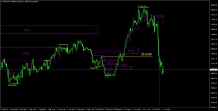 CHOCH – слом трендовой структуры. Liquidity – Ликвидность, Stop Loss трейдеров, которые маркет-мейкеры используют для набора своих позиций. FVG – Область ценовой неэффективности. Цена очень быстро проходит такие области, что указывает на полное отсутствие одной из сторон на рынке. В последствии цена имеет свойство возвращаться и получать реакцию от таких областей. IFVG – Инвертированная область ценовой неэффективности. После возврата к такой области, цена не получает от нее реакцию, а импульсно пробивает, а затем тестирует ее с другой стороны. OB – Ордер-блок. Свеча, на которой маркет-мейкер открывал позицию с целью забора ликвидности для формирования собственной позиции в противоположном направлении.Материал предоставлен компанией InstaForex - www.instaforex.comНовость предоставлена компанией