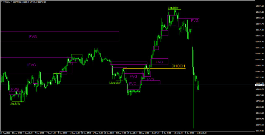 На 4-часовом таймфрейме цена резко обрушилась вниз после снятия ликвидности на продажу и тройной отработки «медвежьего» FVG. Как видим, предупреждения о грядущем падении были даже на 4-часовом ТФ. Напомним, что на дневном ТФ перед падением был сформирован еще один «медвежий» OB и вновь была снята ликвидность на продажу. Поэтому возможностей открывать короткие позиции у трейдеров было в избытке. В ходе последнего падения было сформировано несколько «медвежьих» FVG, однако в текущих обстоятельствах они не представляют особой ценности для торговли. Теперь нужно дождаться, чтобы рынок немного успокоился.Рекомендации по торговле BTC/USD: