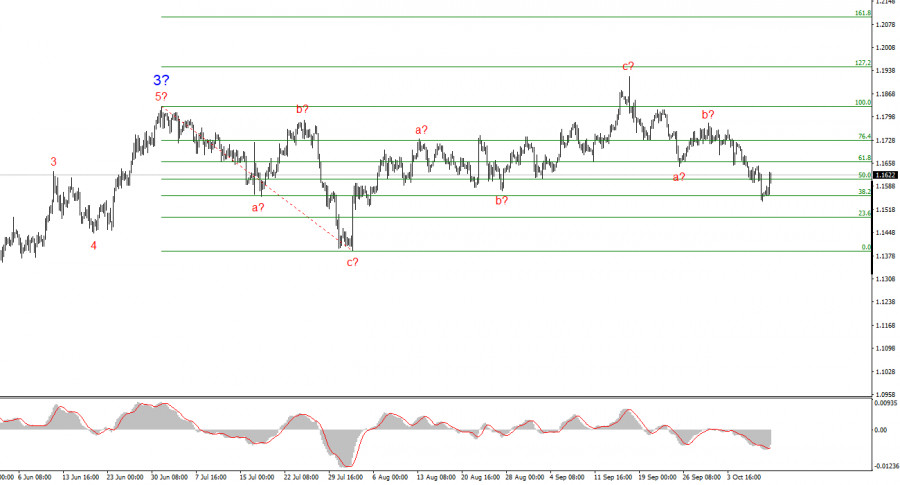 Европейская валюта продолжает построение третьей трехволновой структуры подряд, поэтому сразу же можно предположить, что снижение инструмента близится к своему завершению. Безусловно, любая коррекционная структура в любой момент может принять более сложный вид, потому что только участники рынка определяют, в какую сторону им двигать инструмент, а никак не волновой анализ. Однако если рассматривать только простейшие волновые структуры(о чем я всегда говорю), то мы уже сейчас видим отсутствие тренда и трехволновую коррекцию. Следовательно, можно допускать, что уже на следующей неделе повышение возобновится. Также в пользу роста стоимости европейской валюты говорит и новостной фон. Напомню, что в 2025 году рынок по большей части отыгрывал американский новостной фон, а европейские новости меркли в тени американских. Например, рынок никакого внимания не обращал на смягчение денежно-кредитной политики ЕЦБ. В последние две недели рынок то ли был одержим построением коррекционного набора волн, то ли игнорировал все новости из США. А, вероятнее всего, и первое, и второе. Если говорить по правде, то даже в последние две недели американская валюта вполне могла дешеветь в цене. Но снижение инструмента привело к тому, что волновая разметка усложнилась, что всегда нехорошо для трейдеров. На следующей неделе в Европе выйдут следующие отчеты. Инфляция в Германия за сентябрь в финальной оценке, индекс экономических ожиданий в Германии, промышленное производство в Евросоюзе, инфляция в Евросоюзе за сентябрь в финальной оценке. Из всего этого списка(кстати, весьма небольшого) можно отметить только промышленное производство, а остальные отчеты не будут иметь влияния на настроения рынка. Также состоится выступление президента ЕЦБ Кристин Лагард, но г-жа Лагард за последние две недели выступила 6 раз. Ее основная мысль о том, что новое смягчение денежно-кредитной политики не требуется, донесена до участников рынка на все 100%. Следовательно, новостной фон в ЕС будет слабым, а в США(забегая вперед) – урезанным, потому что в Америке продолжается «шатдаун». Но рынок все равно будет пристально следить за американскими событиями, потому что там есть, на что обратить внимание.