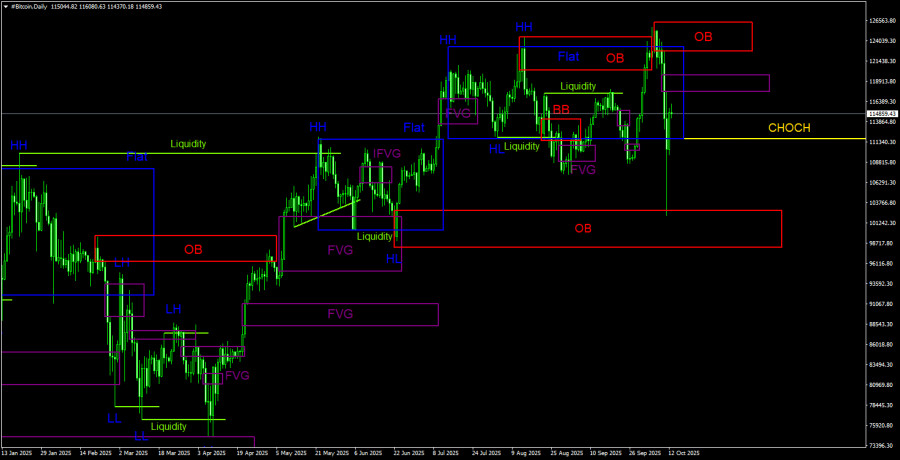 На 4-часовом таймфрейме цена резко обрушилась вниз после снятия ликвидности на продажу и тройной отработки «медвежьего» FVG. Как видим, предупреждения о грядущем падении были даже на 4-часовом ТФ. Напомним, что на дневном ТФ перед падением был сформирован еще один «медвежий» OB и вновь была снята ликвидность на продажу. Поэтому возможностей открывать короткие позиции у трейдеров было в избытке, а ближайшая цель, о которой мы говорили, достигнута. В ходе пятничного обвала был сформирован «медвежий» FVG, и на дневном ТФ имеется «медвежий» FVG. Эти две области POI можно использовать для поиска сигналов на продажу.Рекомендации по торговле BTC/USD: