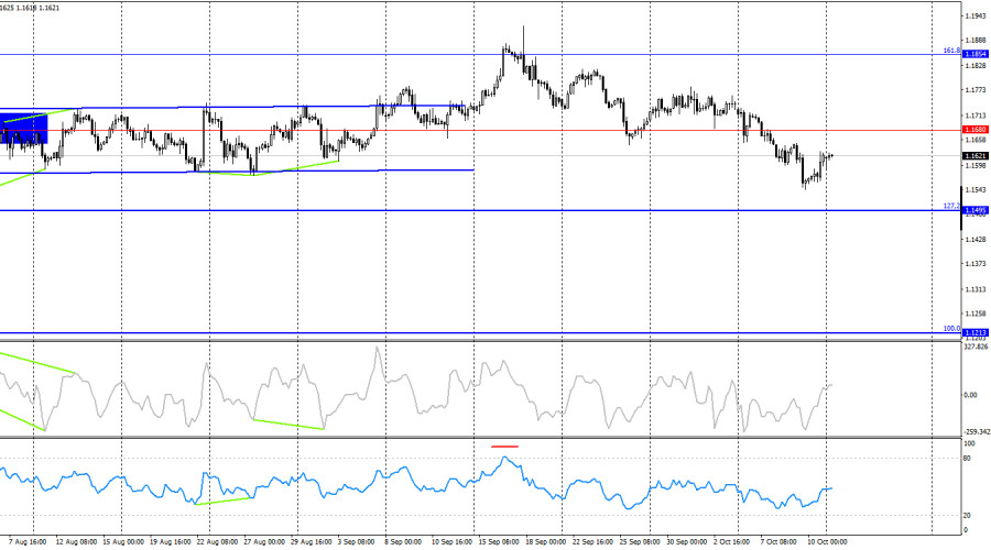 Ситуация с волнами на часовом графике остается простой и понятной. Последняя завершенная волна вверх не пробила пик предыдущей волны, а новая волна вниз пробила предыдущий лоу. Таким образом, в данное время тренд остается «медвежьим». Последние данные по рынку труда и изменившиеся перспективы ДКП ФРС поддерживают трейдеров-быков, поэтому я ожидаю смену тренда на «бычий». Для того, чтобы «медвежий» тренд завершился, требуется закрепление цены выше последнего пика – 1,1779. В пятницу интересных экономических отчетов было немного – только индекс настроения потребителей от Мичиганского университета, на который трейдеры не обратили никакого внимания. Зато вечером Трамп объявил о намерении с 1 ноября повысить пошлины на импорт из Китая на 100%. Хочу заметить, что пошлины, равные 100%, поверх тех, которые уже существуют, означают фактически остановку торговли между Китаем и США. По крайней мере, экспорт из Китая в США упадет практически до нулевых значений точно, как уже было прошедшим летом, когда взаимные пошлины между двумя странами выражались трехзначными цифрами. В ближайшее время следует ожидать ответа от Пекина, но уже сейчас можно не сомневаться, что Китай повысит все пошлины на импорт из США зеркально. Таким образом, начинается новый виток глобальной торговой войны, что не играет на руку медведям и доллару США. Я по-прежнему ожидаю возобновления «бычьего» тренда.