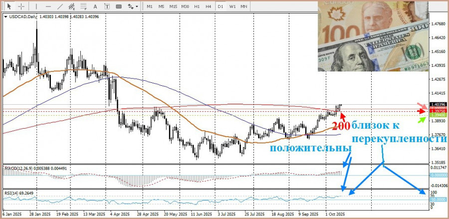 На данный момент пара USD/CAD торгуется выше 200-дневной простой скользящей средней (SMA). Спотовые цены преодолели круглый уровень 1,400.