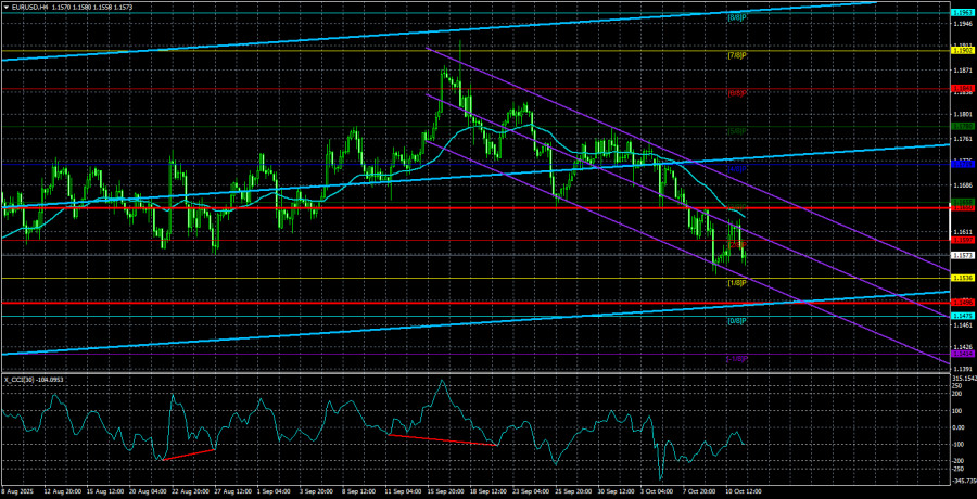 Валютная пара EUR/USD в течение понедельника вновь не показала никаких интересных движений, большую часть дня будучи обездвиженной. В первой половине дня имело место небольшое снижение котировок, которое могло быть спровоцировано, конечно же, Дональдом Трампом. Откровенно говоря, мы допускали, что доллар США может начать дешеветь с самого открытия рынка. Но то ли рынку уже надоели новые пошлины Трампа или разговоры о новых пошлинах, то ли рынок не поверил в жесткость позиции американского лидера по отношению к Китаю. Так или иначе доллар избежал наихудшей участи. Напомним, что в пятницу президент США объявил о повышении пошлин для Китая на 100% с 1 ноября. Такой шаг был предпринят в связи с тем, что Китай решил ужесточить правила экспорта редкоземельных металлов, пользуясь своим «почти монопольным» статусом. Трамп тут же обвинил Китай в попытке взять в заложники весь мир и пригрозил повышением пошлин. Правда уже в субботу президент сменил гнев на милость и сообщил, что он не планирует вызывать Великую депрессию в Китае, и что все будет хорошо. На основании чего были сделаны такие заявления, неизвестно, так как на текущий момент никаких новых переговоров между Вашингтоном и Пекином нет. По сути, Трамп походил конем вперед, а уже на следующем ходе вернул фигуру на исходную позицию. Все трейдеры отлично понимают, что слова Трампа следует делить на 8. То, что сейчас американский президент хочет ввести новые пошлины, абсолютно не означает, что он их введет. Возможно, именно поэтому доллар и избегает вполне закономерного падения. Однако хотим также напомнить, что судьба доллара, можно сказать, в любом случае предрешена. На данный момент времени мы не видим ни одной причины у рынка покупать доллар на среднесрочную перспективу. ЕЦБ завершил цикл смягчения монетарной политики, а ФРС так или иначе будет продолжать снижение ключевой ставки. При чем, если в 2025 году речь идет об 1-2 снижениях, то в следующем году ставка может полететь вниз гораздо быстрее, когда Пауэлл покинет свой пост председателя ФРС. Помимо этого, мы не считаем, что торговая война Трампа не будет разрастаться дальше. Как видим, пошлины остаются основным инструментом влияния Трампа на другие государства. Таким образом, если кто-то в мире посмеет ослушаться Трампа, можно не сомневаться – нарвется на очередные пошлины. Влияния у Трампа нет только на те государства, которые не ведут практически никакой торговли с Америкой. Например, Россия. Или же на страны, которые исторически не слишком любят США. Например, Венесуэла. Против Москвы у Трампа есть только один аргумент – «я даю им две недели срока», а против Венесуэлы вполне может и потрясти оружием. На дневном ТФ видно, что, во-первых, восходящий тренд не завершен, во-вторых, пара уже несколько месяцев находится во флэте. Поэтому дальнейшее укрепление доллара возможно, но только в рамках флэта. Средняя волатильность валютной пары EUR/USD за последние 5 торговых дней по состоянию на 14 октября составляет 77 пунктов и характеризуется, как «средняя». Мы ожидаем движение пары между уровнями 1,1496 и 1,1650 во вторник. Старший канал линейной регрессии направлен вверх, что по-прежнему указывает на восходящую тенденцию. Индикатор CCI заходил в область перепроданности, что может спровоцировать новый виток восходящего тренда. Ближайшие уровни поддержки: