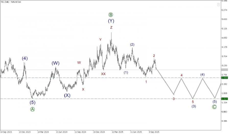 Глядя на текущий график, можно заметить, что по газу может формироваться крупный коррекционный тренд. На текущем графике представлена разметка большой действующей волны (Y), принимающей форму тройного зигзага W-X-Y-XX-Z. На текущем графике мы видим, что действующая волна Z похожа на стандартный зигзаг, внутри которого завершен импульс [A]. Сейчас может формироваться коррекционная подволна [B], которая, судя по всему, принимает форму двойного зигзага (W)-(X)-(Y). Предполагается, что на сегодняшний день завершена только первая действующая волан (W), она приняла форму двойного зигзага W-X-Y. Сейчас в процессе развития может находиться противодействующая волна связка (X), она тоже представляет собой двойной зигзаг W-X-Y. На последнем участке графика может формироваться финальная зигзагообразная волна Y. Внутри волны Y могла подойти к концу коррекционная подволна [B], поэтому в ближайшее время участников рынка может ждать разворот цены и начало падения в импульсе [C]. Вполне возможно, что быки поведут рынок за собой в сторону уровня 1.52. На указанной отметке ранее была завершена подволна [A]. В текущей ситуации можно рассматривать открытие коротких позиций. Торговые рекомендации: Sell 3.01, takeprofit 2.59.
