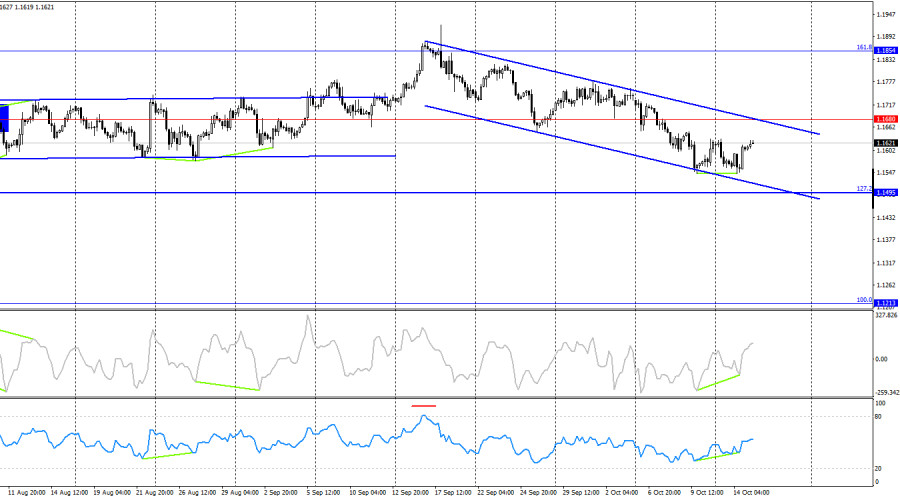 Ситуация с волнами на часовом графике остается простой и понятной. Последняя завершенная волна вверх не пробила пик предыдущей волны, а новая волна вниз пробила предыдущий лоу. Таким образом, в данное время тренд остается «медвежьим». Последние данные по рынку труда и изменившиеся перспективы ДКП ФРС поддерживают трейдеров-быков, поэтому я ожидаю смену тренда на «бычий». Для того, чтобы «медвежий» тренд завершился, требуется закрепление цены выше последнего пика – 1,1779. Во вторник трейдеры-медведи намеревались провести еще одну атаку, и с самого утра информационный фон делал такой вариант вполне реалистичным. Индексы экономических ожиданий ZEW оказались слабее прогнозов, что и позволило медведям атаковать с новыми силами. Однако вечером президент FOMC Джером Пауэлл вновь сообщил, что перспективы экономики и инфляции остаются неопределенными, но в то же время не сильно изменились с последнего заседания ФРС. По его словам, экономические данные, вышедшие до «шатдауна», показывают ускорение инфляции и рост экономической активности. Пауэлл также отметил рост безработицы в последние месяцы, но сообщил, что этот показатель все еще остается низким. «Краткосрочные ожидания по инфляции выросли из-за импортных пошлин, но в долгосрочном плане прогнозы по инфляции остаются на уровне 2%», – сообщил глава ФРС. Таким образом, ничего важного Пауэлл не сообщил во вторник, но трейдеры продолжают сомневаться в том, что ФРС решится на снижение процентной ставки в октябре без экономической статистики. Сомнений сейчас вообще очень много на рынке. Большая их часть связана с политикой ФРС и Дональда Трампа.