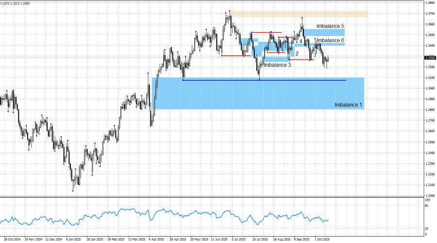 Британец в данное время «висит в воздухе». Рядом с ценой нет никаких паттернов, которые могли бы остановить падение или же привести к развороту вверх. Ближайшим интересным уровнем является 1,3140 – два последних лоу цены. Таким образом, велика вероятность, что в случае, если британец доберется до этого уровня, с него будет производен съем ликвидности с последующим разворотом вверх. Или же «бычий» тренд будет сломан, во что поверить сейчас крайне тяжело. Во вторник в Великобритании вышли отчеты по заработным платам, безработице и заявкам на пособия по безработице, а в четверг – выйдут данные по ВВП и промышленному производству. Пока что два из трех отчетов показали значения хуже, чем ожидали трейдеры. Таким образом, если быки и намеревались перейти в наступление, то пока отказались от этого плана. Графический анализ показывает реакцию цены на «медвежий» имбаланс 6. Однако для дальнейшего падения котировок нужен информационный фон, которого пока нет. За последние недели медведи, кажется, использовали все доступные им факторы, но всему рано или поздно приходит конец. Чем ниже проседает курс британской валюты, тем выгоднее быкам открывать новые сделки на покупку. «Бычьих» паттернов в данное время нет, поэтому возобновление роста (потенциальное) будет достаточно тяжело отработать мгновенно. За последние недели образовалось три «медвежьих» имбаланса, два из которых были отработаны или инвалидированы. Имбаланс 6 предоставлял возможность открывать сделки на продажу, но напоминаю, что тренд по британцу остается «бычьим». Таким образом, приоритетными являются покупки, а «медвежьи» паттерны я бы не стал рассматривать, так как в новый «медвежий» тренд я начну верить, только когда тренд поменяется. «Медвежий» ордер-блок остается важным паттерном. Реакция на этот паттерн последовала, но я не ждал и не жду большего, чем коррекционный откат. Коррекционный откат затягивается. Информационный фон сейчас поддерживает больше быков, но медведи атаковали очень уверенно. Реакция на ордер-блок – это сильный сигнал, но в то же время информационный фон для доллара в 2025 году крайне редко бывает благоприятным. Давление Дональда Трампа на ФРС, фиктивные увольнения чиновников, вечная критика Джерома Пауэлла, продолжающая торговая война, «шатдаун» и новая эскалация торговой войны между США и Китаем – это те факторы, которые не позволяют мне прогнозировать рост доллара. Трейдеры в данное время закрывают глаза на многий негатив для доллара, но на длинной дистанции принимают верные решения. В общем и целом, могу сказать следующее. В «медвежий» тренд по британцу я не верю точно также, как в «медвежий» тренд по европейцу. Слишком много факторов риска скопила американская валюта. Текущий «бычий» тренд можно будет считать завершенным лишь ниже двух лоу (от 12 мая и 1 августа). Эти лоу практически совпадают. Только ниже них произойдет слом «бычьей» структуры. Однако для меня очевидна простая истина – без информационной поддержки любое «медвежье» начинание имеет крайне низкие шансы на полноценную реализацию. Когда произойдет слом тренда, тогда предлагаю рассматривать «медвежьи» паттерны и сделки на продажу. Календарь новостей для США и Евросоюза: 15 октября календарь экономических событий не содержит в себе ни одной интересной записи. Влияние информационног