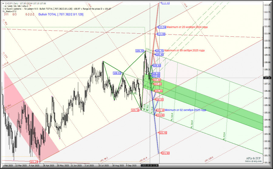 Операционный масштаб Minor (таймфрейм Daily)CAD/JPY - Daily - обзор вариантов движения с 17 октября 2025 г.___________________Canadian Dollar vs Japanese YenРазвитие движения CAD/JPY-Daily с 17 октября 2025 года будет обусловлено границами зоны равновесия (106.66 - 107.20 - 107.80) вил младшего операционного масштаба Minute-h4 и канала 1/2 Median Line Minute-h4 (107.50 - 108.00 - 108.60) - детали отработки указанных уровней смотрим на графике ниже.Восходящее движение.Пробой уровня сопротивления 108.60 на верхней границе канала 1/2 Median Line вил младшего операционного масштаба Minute-h4 сделает возможным продолжение восходящего движения этого валютного инструмента к целям:- начальная линия SSL Minute-h4 (109.45);