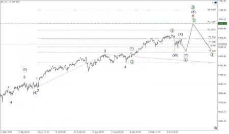 В глобальной перспективе по индексу SP500 может формироваться крупный импульс (1)-(2)-(3)-(4)-(5). Подволна (1) и (2) сформированы. На последнем участке графика представлена восходящая импульсная волна (3), размеченная подволнами 1-2-3-4-5. В составе волны (3) завершенными смотрятся подволны 1-2-3-4. Коррекционная волна 4 не так давно подошла к концу и приняла форму двойного зигзага. На последнем участке цены мы можем наблюдать построение новой и финальной волны 5. Волна 5 может принять форму импульса [1]-[2]-[3]-[4]-[5]. Завершены подволны [1]-[2], и сейчас растем в более мощной подволне [3]. Вероятно, быки нацелены на предыдущий максимум 6864, на указанном уровне величина импульса 5 будет равна 100% по расширению Фибоначчи от волны 3. В текущей ситуации можно рассматривать открытие длинных позиций с целью забрать прибыль на завершении импульсного роста в районе предыдущего максимума. Торговые рекомендации: Buy 6664.64, takeprofit 6988.10.