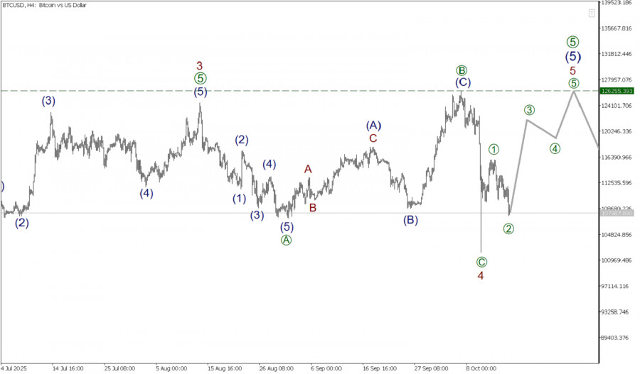 FxSignal 16-10-2025, 23:04 15 Аналитика, прогнозы валютного рынкаВ долгосрочной перспективе по криптовалютной паре BTC/USD может формироваться крупный бычий импульс 1-2-3-4-5. Большая часть указанной фигуры полностью завершена. На текщем графике представлена разметка крупной коррекции 4, она имеет форму стандартного зигзага [A]-[B]-[C], где коррекция [B] приняла форму волновой плоскости (A)-(B)-(C). На последнем участке графика может формироваться начальная часть бычьего импульса 5, который будет состоять из подволн [1]-[2]-[3]-[4]-[5]. Скорее всего, первые две подволны [1]-[2] уже построены. В ближайшее время ожидается развитие подволн [3]-[4]-[5]. Большая вероятность, что быки нацелены на преддщий максимум 126255.43, который отметила коррекция [B]. В текущей ситуации можно рассматривать открытие длинных позиций. С целью забрать прибыль на окончании бычьего импульса. Торговые рекомендации: buy 107987.89, takeprofit 126255.43.