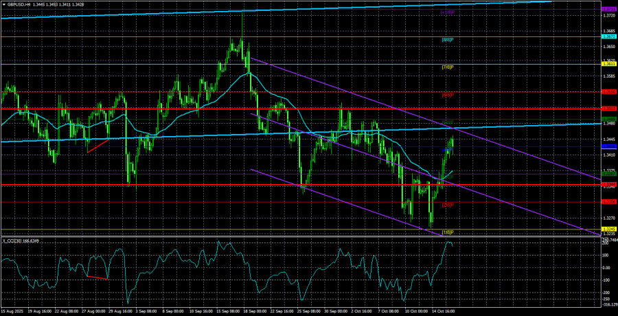 Валютная пара GBP/USD в течение четверга продолжала восходящее движение, как и должно быть. Честно говоря, сейчас даже не имеет особого смысла рассматривать фундамент и макроэкономику. Во-первых, пара GBP/USD остается в рамках флэта на дневном ТФ. А это означает, что цена может двигаться на сотни пунктов в любую сторону даже без конкретных оснований и причин(что собственно мы и наблюдали в последние недели). Во-вторых, ничего нового и ничего позитивного для доллара в мире не происходит. Трамп продолжает угрожать, конфликтовать, вводить тарифы, санкции и строить весь мир по струнке. В-третьих, восходящий тренд в долгосрочной перспективе сохраняется, а даже гипотетических причин роста у валюты США мы найти не можем. Поэтому складывается ощущение, что пара может простоять в боковом канале еще месяц, два или три, но затем возобновится рост при любых раскладах. На этой неделе британская валюта перешла в рост, несмотря на противоречивую статистику в Великобритании. С одной стороны, уровень безработицы вырос, с другой стороны – отчеты по промпроизводству и ВВП оказались лучше прогнозов. Что интересно: уровень безработицы практически не помешал росту британской валюты, а отчеты по производству и ВВП рынок просто проигнорировал. Таким образом, в очередной раз можно отметить, что британская статистика трейдеров не слишком сильно волнует. Если так, то интересует их только американский фундаментальный и макроэкономический фон. И если начать перечислять все причины для падения американской валюты, то и статьи не хватит. Сегодня – последний день очередной рабочей недели, и никаких важных событий и публикаций не ожидается ни в Великобритании, ни в США. Конечно, Дональд Трамп и его верный соратник Скотт Бессент могут сделать новые резонансные заявления в адрес Китая, Индии или ФРС, но в том то и дело, что резонансное событие – только тогда резонансное, когда не происходит каждый день. Ну узнает рынок о том, что Трамп собирается обложить Китай пошлинами не в 500%, а в 1500%. Что поменяется? Для доллара ситуация лучше не станет, а хуже она становится уже по накатанной дорожке, каждую неделю или месяц. К слову, в противостоянии с демократами Трамп также не проявляет никаких дипломатических навыков. Напомним, что ситуация с бюджетом – это чуть ли не первая ситуация в 2025 году, когда демократы смогли высказать свое слово и открыто «поставить палку в колесо» Трампу. Обычно Трамп принимал все решения самостоятельно, даже не спрашивая разрешения у Конгресса США. Самое удивительное, что на Трампа подают иски в суд за откровенное нарушение законов США и превышение полномочий, но никто не может отменить ни единого спорного решения президента. Штаты буквально за год превратились из демократического и юридического государства в «страну настроения одного человека». Сегодня Трамп проиграет в гольф, завтра – введет пошлины на 500%. Сегодня Трамп не получит Нобелевскую премию, завтра в этом окажется виновата Индия, которая не хочет отказываться от закупок выгодной для нее нефти. Цирк. Средняя волатильность пары GBP/USD за последние 5 торговых дней составляет 84 пункта. Для пары фунт/доллар это значение является «средним». В пятницу, 17 октября, таким образом, мы ожидаем движения внутри диапазона, ограниченного уровнями 1,3344 и 1,3512. Старший канал линейной регрессии направлен в