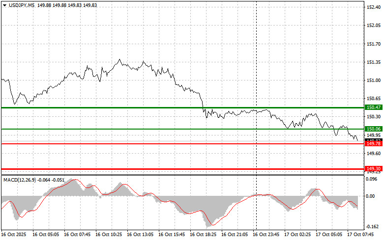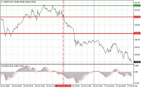 Разбор сделок и советы по торговле японской иенойТест цены 151.06 пришелся на момент, когда индикатор MACD много прошел вниз от нулевой отметки, что ограничивало нисходящий потенциал пары. Второй тест этой цены совпал с моментом нахождения MACD в области перепроданности, что привело к реализации сценария №2 на покупку доллара, но до роста пары дело так и не дошло. Японская иена продолжает демонстрировать устойчивый рост. Однако падение пары USD.JPY обусловлено скорее слабостью американской валюты, нежели силой самой иены. Безусловно, иена традиционно рассматривается как валюта-убежище, и в периоды глобальной экономической нестабильности, которая сейчас вызвано торговым противостоянием США и Китая, спрос на нее возрастает. Однако, в текущей ситуации ослабление доллара, вызванное ожиданиями смягчения монетарной политики ФРС, оказывает более существенное влияние на динамику пары USD/JPY. Экономические показатели Японии также не дают однозначных сигналов. Хотя экспорт сохраняет устойчивость, внутренний спрос остается слабым. В этих условиях Банк Японии вряд ли пойдет на ужесточение монетарной политики в ближайшем будущем.Что касается внутридневной стратегии, то больше буду опираться на реализацию сценариев №1 №2.Сценарии на покупкуСценарий №1: покупать USD/JPY сегодня планирую при достижении точки входа в районе 150.06 (зеленая линия на графике) с целью роста к уровню 150.47 (более толстая зеленая линия на графике). В районе 150.47 собираюсь выходить из покупок и открывать продажи в обратную сторону (расчет на движение в 30-35 пунктов в обратную сторону от уровня). К покупкам пары лучше всего возвращаться на коррекциях и серьезных просадках USD/JPY. Важно! Перед покупкой, убедитесь в том, что индикатор MACD находится выше нулевой отметки и только начинает свой рост от нее.Сценарий №2: покупать USD/JPY сегодня также планирую в случае двух подряд тестов цены 149.78 в момент, когда индикатор MACD будет находиться в области перепроданности. Это ограничит нисходящий потенциал пары и приведет к обратному развороту рынка вверх. Можно ожидать рост к противоположным уровням 150.06 и 150.47.Сценарии на продажу Сценарий №1: продавать USD/JPY сегодня планирую лишь после обновления уровня 149.78 (красная линия на графике), что приведет к быстрому снижению пары. Ключевой целью продавцов будет уровень 149.30, где собираюсь выходить из продаж, а также открывать сразу покупки в обратную сторону (расчет на движение в 20-25 пунктов в обратную сторону от уровня). Продавать лучше, как можно выше. Важно! Перед продажей, убедитесь в том, что индикатор MACD находится ниже нулевой отметки и только начинает свое снижение от нее. Сценарий №2: продавать USD/JPY сегодня также планирую в случае двух подряд тестов цены 150.06 в момент, когда индикатор MACD будет находиться в области перекупленности. Это ограничит восходящий потенциал пары и приведет к обратному развороту рынка вниз. Можно ожидать снижения к противоположному уровню 149.78 и 149.30.Что на графике: Тонкая зеленая линия – цена входа, по которой можно покупать торговый инструмент.