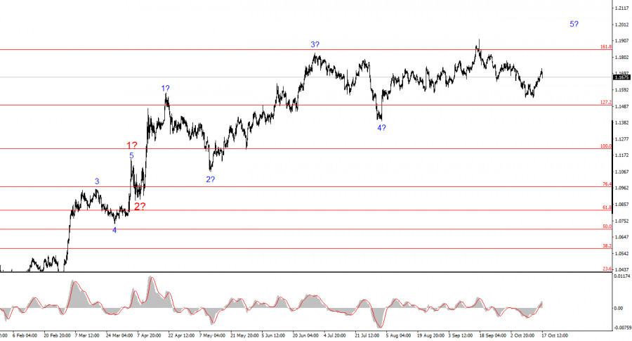 Курс инструмента EUR/USD в течение пятницы снизился на 20 базовых пунктов, что нельзя считать серьезным изменением. Сегодня новостной фон сводился только к политике, причем связанной только с США. «Шатдаун» в Америке продолжается, а многие аналитики заговорили о новом рекордном сроке остановки работы правительства и всех государственных структур, хотя еще неделю назад были уверены в том, что «шатдаун» продлится «пару недель». Однако Дональд Трамп продолжает стоять на своем, а демократы на своем. Голосование по бюджету в Сенате США уже начинает походить на казино, где игрок ставит на определенную ячейку в надежде, что на этот раз ему повезет. Так и республиканцы продолжают инициировать все новые и новые голосования в надежде на то, что им просто повезет. Демократы продолжают требовать сохранения всех медицинских и социальных программ для малообеспеченных слоев американского населения, которые по факту сильно урезал Дональд Трамп своим «Одним большим и прекрасным законом». Трамп и его команда продолжают стоять на своем – сначала одобрение бюджета, затем – переговоры о судсидиях. Однако верить Трампу – тоже самое, что верить в пришествие инопланетян. Весь мир из раза в раз становится свидетелем очередных обещаний президента США, которые не выполняются, а затем Трамп просто сообщает, что его неверно поняли или же что он просто пошутил. Под занавес недели доллар немного подправил свое положение, но в данное время уже могло начаться построение повышательной серии волн.Общие выводы.