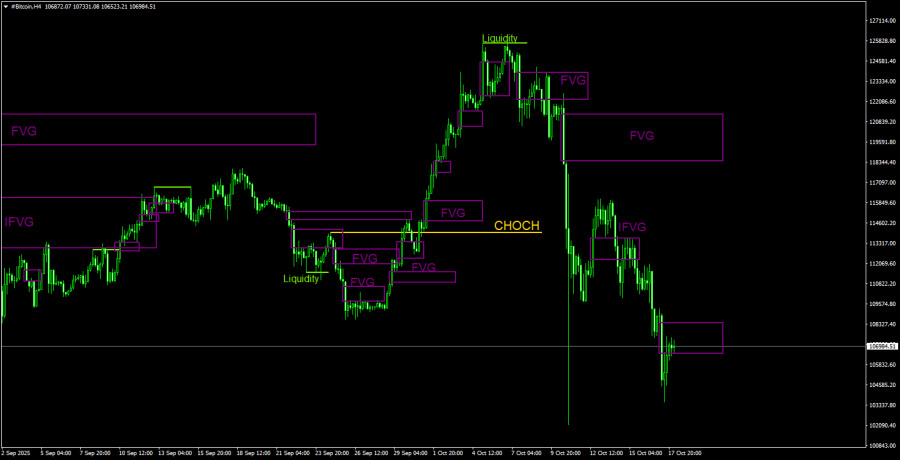 На 4-часовом таймфрейме цена резко обрушилась вниз после снятия ликвидности на продажу и тройной отработки «медвежьего» FVG. Как видим, предупреждения о грядущем падении были даже на 4-часовом ТФ. Напомним, что на дневном ТФ перед падением был сформирован еще один «медвежий» OB и вновь была снята ликвидность на продажу. Поэтому возможностей открывать короткие позиции у трейдеров было в избытке, а ближайшая цель, о которой мы говорили, достигнута. От последнего «медвежьего» IFVG падение возобновилось. В данное время цена вернулась в «медвежий» FVG, поэтому вновь возможна реакция, разворот и новое падение.Рекомендации по торговле BTC/USD:
