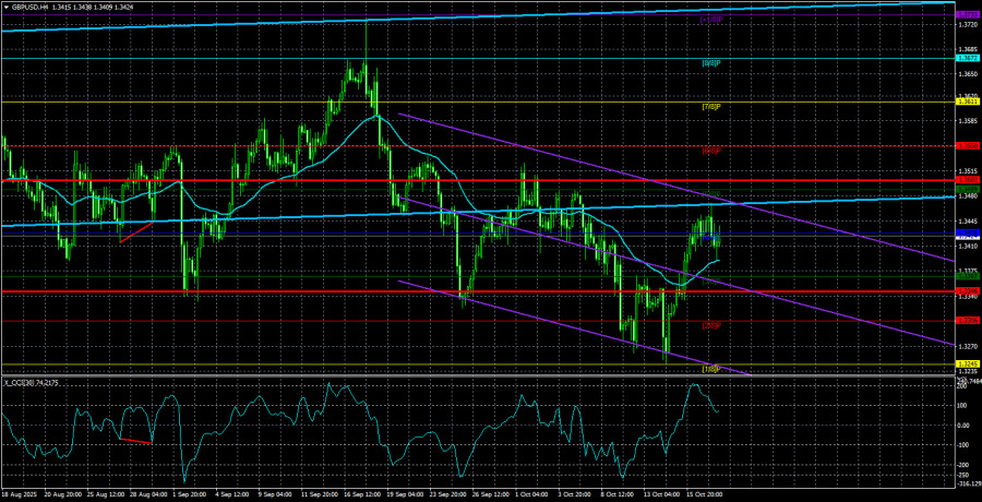 Валютная пара GBP/USD в течение пятницы также показала небольшое нисходящее движение к концу дня, но снизилась гораздо слабее, чем пара EUR/USD. Следует сразу заметить, что никаких макроэкономических событий или публикаций в последний торговый день недели не было ни в Великобритании, ни в США. Рынок мог реагировать лишь на политические событий, коих сейчас в достатке. Напомним, что Дональд Трамп не отступает от мысли остановить военный конфликт между Украиной и Россией, называя его «девятой войной, которую он завершит». Мы, возможно, профаны в математике, но не смогли насчитать еще 8 войн, которые Трамп завершил в 2025 году. Возможно, речь идет о войнах, которые даже не начинались. Ведь американский президент неоднократно заявлял, что если бы он был президентом США, то война между Украиной и РФ никогда бы не началась. Однако война на Украине трейдеров пока не слишком интересует. Куда больше внимания занимает торговая война Трампа против всего мира и «голубиные» перспективы монетарной политики ФРС. О торговой войне мы уже поговорили в статье по EUR/USD. Остается лишь напомнить о положении ФРС, которому явно не позавидуешь. Несмотря на то, что в целом риторика представителей Монетарного комитета ФРС остается «голубиной», рынок в некоторых случаях продолжает выдвигать чуть ли не конспирологические теории об истинной позиции ФедРезерва. Напомним, что с самого начала текущего года ФРС допускала максимум два снижения ключевой ставки. Об этом свидетельствовали и заявления чиновников регулятора, и регулярные публикации графиков «dot-plot». К концу года, на фоне торговой и иммиграционной политики Дональда Трампа, стало ясно, что рынок труда сжимается и не может выдерживать такого натиска американского президента. Поэтому ФРС теперь ВЫНУЖДЕНА мыслить гораздо более «по-голубиному», чем в начале года. Один раз ФедРезерв ставку уже снизил и, скорее всего, понизит ее еще дважды до конца года. Таким образом, настрой регулятора стал более «голубиным», а не «менее голубиным», как считают некоторые эксперты. Также мы считаем неправильным рассматривать перспективы ФРС в отрыве от перспектив ЕЦБ и Банка Англии. ЕЦБ, напомним, завершил цикл смягчения монетарной политики, а Банк Англии, скорее всего, возьмет длительную паузу из-за инфляции, превышающей целевой уровень почти в 2 раза. Поэтому ФРС в ближайшие месяцы будет понижать ключевую ставку в гордом одиночестве. И это гораздо более значимый фактор, чем «ФРС будет снижать ставку неопределенными темпами». С какой стороны не посмотри, а доллар все равно будет падать. Конечно, мы бы хотели напомнить, что никто на рынке не знает и не может знать будущего. Ошибаются все. Как будут действовать маркет-мейкеры, не знает никто, кроме самих маркет-мейкеров. А они могут действовать в полном отрыве от фундаментального и макроэкономического фона. Поэтому мы не гарантируем, что пара GBP/USD будет только расти в ближайшие годы. Однако текущая картина положения вещей в мире указывает именно на это. Средняя волатильность пары GBP/USD за последние 5 торговых дней составляет 78 пунктов. Для пары фунт/доллар это значение является «средним». В понедельник, 20 октября, таким образом, мы ожидаем движения внутри диапазона, ограниченного уровнями 1,3346 и 1,3502. Старший канал линейной регрессии направлен вверх, что указывает на однозначную восхо