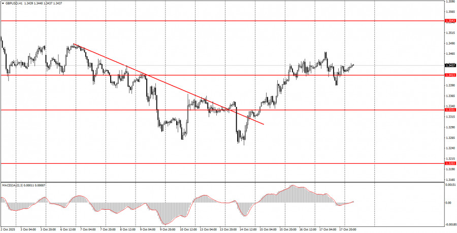 На часовом ТФ пара GBP/USD наконец-то начала формирование новой восходящей тенденции, которая может стать началом нового витка глобального восходящего тренда. Как мы уже говорили, никаких оснований для длительного роста доллара нет, поэтому в среднесрочном плане ожидаем движения только на Север. Политика Дональда Трампа, который резко активизировался с пошлинами в последние недели, будет и дальше заставлять рынок отказываться от американской валюты. В понедельник пара GBP/USD может попытаться продолжить восходящее движение, так как тенденция изменилась на восходящую. Отскок от области 1,3413-1,3421 позволит открывать длинные позиции с целью 1,3466-1,3475. Закрепление цены ниже области 1,3413-1,3421 укажет на новый виток нисходящей коррекции. На 5-минутном ТФ сейчас можно сейчас торговать по уровням 1,3102-1,3107, 1,3203-1,3211, 1,3259, 1,3329-1,3331, 1,3413-1,3421, 1,3466-1,3475, 1,3529-1,3543, 1,3574-1,3590, 1,3643-1,3652, 1,3682, 1,3763. В понедельник в Великобритании и США не запланировано ни одного важного события или публикации. Таким образом, реагировать в течение дня трейдерам будет не на что, а волатильность вновь может быть низкой.Основные правила торговой системы: