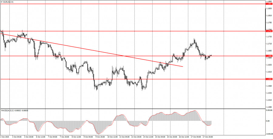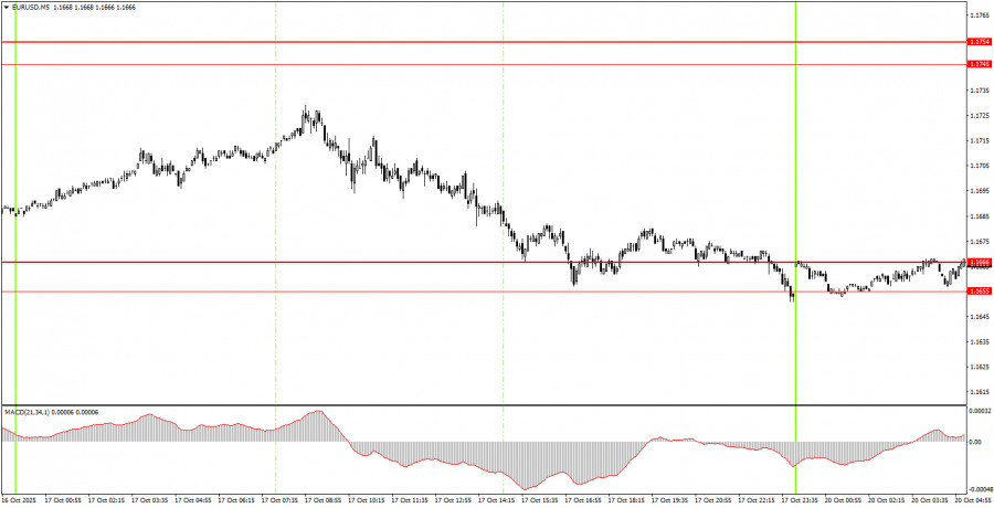 На часовом таймфрейме пара EUR/USD наконец-то показывает признаки восходящего тренда. Нисходящая линия тренда вновь преодолена, а общий фундаментальный и макроэкономический фон остается для доллара США провальным. Таким образом, мы продолжаем ожидать возобновления восходящего тренда 2025 года. В понедельник пара EUR/USD может двигаться в любом направлении, так как фундаментальных и макроэкономических событий вновь будет крайне мало. Начинающие трейдеры могут сегодня спокойно дожидаться формирования сигнала в области 1,1655-1,1666. Однако движения сегодня могут быть слабыми. На 5-минутном ТФ следует рассматривать уровни 1,1354-1,1363, 1,1413, 1,1455-1,1474, 1,1527, 1,1571-1,1584, 1,1655-1,1666, 1,1745-1,1754, 1,1808, 1,1851, 1,1908, 1,1970-1,1988. На понедельник ни в Евросоюзе, ни в США не запланировано ни одного важного события/публикации. Таким образом, волатильность сегодня вновь может быть очень низкой, но европейская валюта может продолжить ползти вверх, так как для этого имеются все необходимые основания.Основные правила торговой системы: