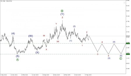Глядя на текущий график, можно заметить, что по газу может формироваться крупный коррекционный тренд. На текущем графике представлена разметка большой действующей волны (Y), принимающей форму тройного зигзага W-X-Y-XX-Z. На текущем графике мы видим, что действующая волна Z похожа на стандартный зигзаг, внутри которого завершен импульс [A]. Сейчас может формироваться коррекционная подволна [B], которая, судя по всему, принимает форму двойного зигзага (W)-(X)-(Y). Предполагается, что на сегодняшний день завершена только первая действующая волан (W), она приняла форму двойного зигзага W-X-Y. Сейчас в процессе развития может находиться противодействующая волна связка (X), она тоже представляет собой двойной зигзаг W-X-Y. На последнем участке графика может формироваться финальная зигзагообразная волна Y. Внутри волны Y могла подойти к концу коррекционная подволна [B], поэтому в ближайшее время участников рынка может ждать разворот цены и начало падения в импульсе [C]. Вполне возможно, что быки поведут рынок за собой в сторону уровня 1.52. На указанной отметке ранее была завершена подволна [A]. В текущей ситуации можно рассматривать открытие коротких позиций. Торговые рекомендации: Sell 3.33, takeprofit 2.59.
