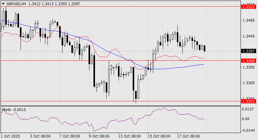 На четырёхчасовом масштабе уровень 1.3369 также усиливается линией Крузенштерна, только уже снизу. Осциллятор Марлин в нейтральной позиции, на нулевой линии. Вероятно продолжение бокового движения.