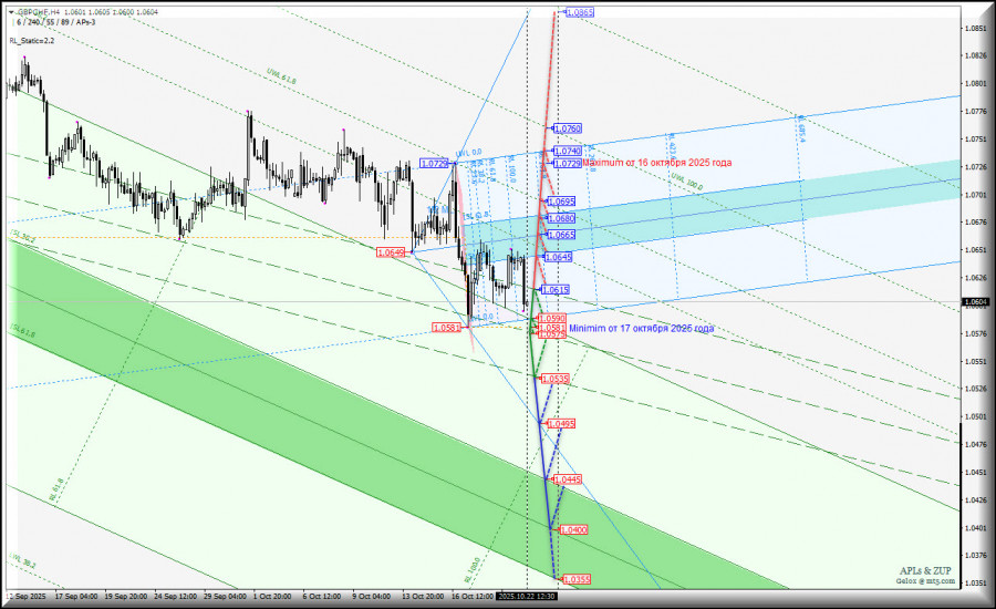 Операционный масштаб Minute (таймфрейм h4)GBP/CHF - h4 - обзор вариантов развития движения данного валютного инструмента c 22 октября 2025 г.____________________Great Britain Pound vs Swiss FrancРазвитие движения GBP/CHF - h4 с 22 октября 2025 года будет обусловлено направлением пробоя границ канала 1/2 Median Line (1.0535 - 1.0575 - 1.0615) вил старшего операционного масштаба Minute-h4 и отработкой начальной линии SSL (1.0590) вил младшего операционного масштаба Minuette-h1 вместе с minimum 1.0581 от 17 октября 2025 года - разметка отработки данных уровней представлена на графике ниже.Нисходящее движение.При пробое нижней границы канала 1/2 Median Line Minute-h4 - уровень поддержки 1.0535 - нисходящее движение GBP/CHF будет направлено к контрольной линии LTL (1.0495) вил младшего операционного масштаба Minuette-h1 и к зоне равновесия (1.0445 - 1.0400 - 1.0355) вил старшего операционного масштаба Minute-h4.Восходящее движение.В случае жн пробоя верхней границы канала 1/2 Median Line (уровень сопротивления 1.0615) вил старшего операционного масштаба Minute-h4 восходящее движение этого кросс инструмента продолжится к зоне равновесия (1.0645 - 1.0665 - 1.0680) вил младшего операционного масштаба Minuette-h1 с последующей перспективой достижения Great Britain Pound vs Swiss Franc предупредительной линии UWL61.8 Minute-h4 (1.0695), maximum 1.0729 от 16 октября 2025 года и конечной линии FSL Minuette-h1 (1.0740).____________________Обзор составлен без учета новостного фона, открытия торговых сессий основных финансовых центров и не является руководством к действию (выставления ордеров "sell" или "buy").Формула расчета индекса доллара: