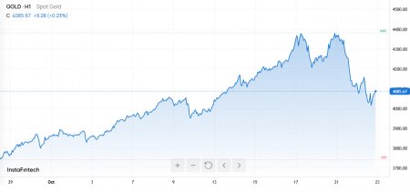 Если вы еще не успели подержать в руках золотой слиток, то не переживайте, ведь уже 21 октября его цена стремительно укатилась вниз. Котировки спот обрушились на 6,3% до $4 082,03 за унцию, а ведь днем ранее золото достигало исторического максимума $4 381!