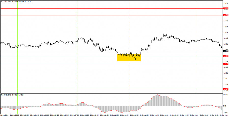 На часовом таймфрейме пара EUR/USD показывает некоторые признаки восходящего тренда. Нисходящая линия тренда вновь преодолена, а общий фундаментальный и макроэкономический фон остается для доллара США провальным. Таким образом, мы продолжаем ожидать возобновления восходящего тренда 2025 года. Однако на дневном ТФ сохраняется флэт, который в данное время выражается низкой волатильностью и алогичными движениями на младших ТФ. В четверг пара EUR/USD может двигаться в любом направлении, так как фундаментальных и макроэкономических событий вновь не будет никаких. Новые торговые сигналы следует ожидать в области 1,1571-1,1584, рядом с которой и находится в данное время цена. На 5-минутном ТФ следует рассматривать уровни 1,1354-1,1363, 1,1413, 1,1455-1,1474, 1,1527, 1,1571-1,1584, 1,1655-1,1666, 1,1745-1,1754, 1,1808, 1,1851, 1,1908, 1,1970-1,1988. На четверг ни в США, ни в Евросоюзе не запланировано важных макроэкономических публикаций, а выступления Кристин Лагард за последние недели уже всем успели надоесть. Никакой новой информации от главы ЕЦБ получено не было.Основные правила торговой системы: