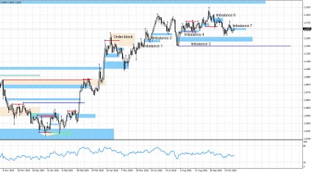 Имбаланс 7 был преодолен, но не инвалидирован. Напомню, что инвалидация – это полная отмена паттерна, а преодоление – ставит под сомнение его отработку. Так вот на текущий момент нельзя даже толком сказать, что случилось с паттерном номер 7. Естественно, на этот имбаланс я уже не обращаю никакого внимания. Чуть ниже имбаланса 7 находится «бычий» имбаланс 3, который является следующей зоной, где трейдеры могут ожидать разворот в пользу европейской валюты и новый рост. А также рассматривать сделки на покупку. Однако теперь нужно, чтобы трейдеры хотя бы начали торговать, а не просто созерцать. Напомню также, что причин у быков продолжать атаковать имеется в достаточном количестве уже сейчас. Это и «голубиные» перспективы ДКП FOMC, это и общая политика Дональда Трампа, это и противостояние США с Китаем, это и акции протеста против Трампа, захлестнувшие Америку в третий раз в текущем году, это и слабость рынка труда, это и не радужные перспективы американской экономики. Однако сейчас не проводят атаки ни быки, ни медведи. Таким образом, графический анализ остается сейчас на первом месте для трейдеров, а разрываться придется между двумя имбалансами. Первый – имбаланс 3 – притягивает к себе цену. Второй – имбаланс 7 – может быть инвалидирован в ближайшее время. В любом случае реакции на имбаланс 7 получено не было, а значит и открывать сделки на покупку оснований тоже не было. Таким образом, ждем европейскую валюту еще ниже и реакции на имбаланс 3. В данное время графический анализ не поддерживает падение европейца. Тренд остается «бычьим», а движения в последние несколько месяцев – это боковик. Таким образом, графический анализ в данное время не позволяет пока рассматривать сделки на продажу. «Шатдаун» остается «головной болью» доллара, на который трейдеры пока никак не реагируют. С одной стороны, он не грозит американской экономике немедленными и серьезными потерями. С другой стороны, чем дольше он продолжается, тем сильнее замедляется экономика США. Каждая неделя может обходиться ей в 15 млрд $. Не следует также упускать из виду торговую войну Трампа и его давление на FOMC. В данное время Трамп активно продвигает идею новых тарифов для Китая и Индии в рамках компании по завершению войны в Украине. Президент США требует отказаться от закупок российской нефти и газа, а от Китая – отменить решение об ужесточении экспортного контроля редкоземельных металлов. Против Индии Трамп уже повысил пошлины до 50%, а против Китая может их повысить с 1 ноября на 100%. Вряд ли такой информационный плацдарм поможет медведям сформировать тренд. Таким образом, в «медвежий» тренд я по-прежнему не верю. Информационный фон, во-первых, крайне сложно интерпретировать в пользу доллара, а во-вторых, он попросту не изменился в последнее время, чтобы ожидать резкую смену в настроении трейдеров. Синяя линия показывает ценовой уровень, ниже которого можно будет считать «бычий» тренд завершенным. До него медведям нужно пройти вниз еще около 220 пипсов, а у меня даже текущее падение вызывает нешуточное удивление. Ближайшей целью для роста европейской валюты может выступать только «медвежий» имбаланс 1,1976 – 1,2092 на недельном графике, который был образован еще в июне 2021 года. Календарь новостей для США и Евросоюза: Евросоюз – Индекс делового климата в Германии (09-00 UTC). 27 октября 