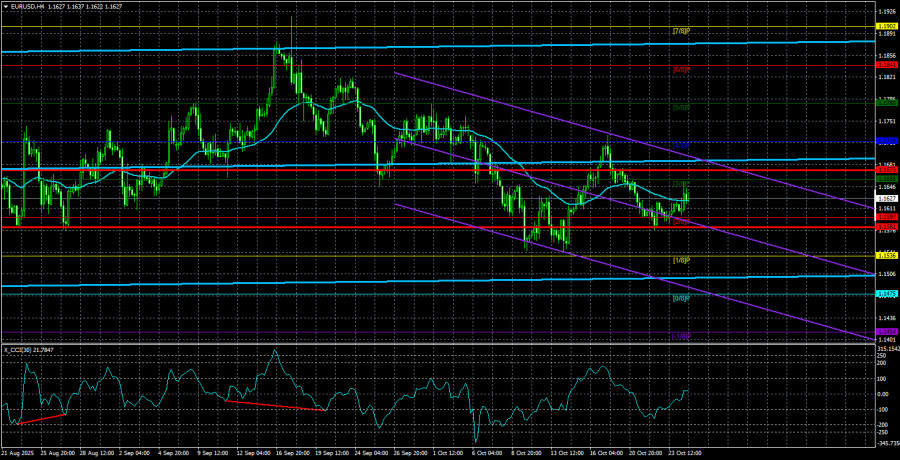Валютная пара EUR/USD в течение пятницы показала волатильность равную 53 пунктам. В принципе, на этом можно заканчивать текущую статью, ибо движений на рынке сейчас нет, а логичных движений – еще меньше. На иллюстрации ниже отлично видно, что максимальная дневная волатильность на прошлой неделе составила 58 пунктов. В пятницу, когда макроэкономический фон был достаточно обильным(и, по сути, это был единственный день, когда были опубликованы хоть какие-то макроэкономические данные), волатильность составила 53 пункта. Таким образом, рынок в данное время просто отказывается торговать, каким бы ни был фундаментальный и макроэкономический фон. В последние несколько недель мы регулярно говорим о том, что движения на валютном рынке алогичные. Нельзя сказать, что за последний месяц никаких новостей вообще не было. И эти новости явно были не на руку американской валюте. Однако доллар растет достаточно бодро, что и вызывает серьезный диссонанс в анализе. Проще говоря, по всем раскладам доллар должен падать сейчас точно также, как в первом полугодии. Но вместо этого мы наблюдаем уже несколько месяцев подряд «американские гонки» в замедленном режиме. Рынок не хочет продавать доллар, не хочет торговать в принципе. И именно поэтому мы продолжает указывать на флэт на дневном ТФ. Мы считаем, что именно он является основной причиной роста доллара, а также основной причиной низкой волатильности. Следует напомнить, что флэт – это всегда рэндом в движениях. Флэт используется крупными игроками для формирования или закрытия позиций. Таким образом, внутри флэта движения могут быть абсолютно разными, вне привязки к макроэкономике или фундаменту. Это именно то, что мы наблюдаем в последние недели. Таким образом, ключевым вопросом сейчас является – когда завершится флэт? Потому что до тех пор, пока он продолжается, любые события не смогут спровоцировать движение, которого все ждут. Может быть, кто-либо на рынке считает, что доллар должен сформировать свой тренд, но и такого движения тоже никто не увидит, пока флэт не завершится. На этой неделе в Евросоюзе состоится заседание ЕЦБ, а в США – заседание ФРС. Эти два события можно считать ключевыми. Разберем заседание Европейского регулятора. Ключевая ставка с вероятностью 100% останется без изменений, так как оснований для ее снижения сейчас нет никаких. Инфляция в Евросоюзе растет в последние месяцы, но недостаточно сильно, чтобы начинать говорить об ужесточении монетарной политики. Таким образом, вероятно, никаких «громких» заявлений мы не услышим от Кристин Лагард, которая за последний месяц выступала не менее 10 раз. Поэтому заседание ЕЦБ с вероятностью 90% окажется полностью «проходным». Упираться на этой неделе все будет опять-таки во флэт на дневном ТФ. Как его отрабатывать и стоит ли это делать, трейдеры должны решить самостоятельно. Средняя волатильность валютной пары EUR/USD за последние 5 торговых дней по состоянию на 27 октября составляет 46 пунктов и характеризуется, как «средняя». Мы ожидаем движение пары между уровнями 1,1581 и 1,1673 в понедельник. Старший канал линейной регрессии направлен вверх, что по-прежнему указывает на восходящую тенденцию. Индикатор CCI заходил в область перепроданности, что может спровоцировать новый виток восходящего тренда. Ближайшие уровни поддержки: S1 – 1,1597 S2 – 1,1536 S3 – 1,1475 Бл