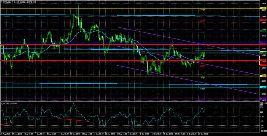 Валютная пара EUR/USD в течение вторника оставалась практически полностью обездвиженной. В целом, практически каждый день множество экспертов, аналитиков и прогнозистов делятся своим мнением, используя выражения «доллар подорожал» или же «почему падает доллар?». Мы тоже используем подобные эпитеты и фразы. Но на самом деле важно понимать, что рост пары на 10 пунктов – это тоже снижение американской валюты. И падение на 10 пунктов – это рост доллара США. Но стоит ли относится к таким ценовым изменениям, как к росту или падению? С нашей точки зрения, когда волатильность на рынке минимальная, говорить о росте или падении вообще бессмысленно. По сути, все движения последних 4 месяцев – это рыночный шум. Что такое рыночный шум? Это незначительные ценовые колебания в ограниченном диапазоне. То есть флэт. При переходе на дневной ТФ именно флэт мы и наблюдаем. Цена уже четыре полных месяца торгуется между уровнями 1,1400 и 1,1830. Кому-то может показаться, что это достаточно широкий диапазон, чтобы считаться флэтом, но в реальности это чистой воды флэт. Просто из-за того, что он формируется на дневном ТФ его ширина соответствующая. Таким образом, все движения внутри флэта не обязаны соответствовать текущему фундаментальному или макроэкономическому фону. За период с 1 июля(когда флэт можно считать начавшимся) мы увидели два витка падения и один – роста. Так фундаментальный и макроэкономический фон остается резко негативным для доллара США, то к каждому витку роста рынок относился, как к закономерному исходу. А к падению – как к технической коррекции или алогичному движению. И именно так и нужно относится к этим движениям, но в целом, абсолютно все ценовые изменения после 1 июля – это коррекция, флэт и рыночный шум. Поэтому в данное время в принципе не особо корректно говорить о том, что доллар подорожал или же наоборот подешевел. Пара EUR/USD уже несколько месяцев подряд стабильно стоит около 1,1650. А вот что будет дальше, как раз можно определить при помощи фундамента и макроэкономики. Напомним, что валютными курсами движет крупный капитал. Некоторые события(о которых известно уже сейчас) он отрабатывает заранее. В некоторых случаях фундаментальный фон для тренда есть, но мы наблюдаем флэт. Примером первого случая может выступать ФРС. С осени 2022 года, когда инфляция в США начала замедляться, рынок ждал смягчения монетарной политики, и именно осенью 2022 года 16-летний рост доллара прекратился. Сейчас же, казалось бы, есть все необходимое, чтобы доллар продолжал падение, но на рынке флэт. Флэт нужен лишь для того, чтобы маркет-мейкеры сформировали новые длинные позиции по паре EUR/USD. С нашей точки зрения, во-первых, глобальный долларовый тренд завершен; а во-вторых, новое падение доллара обязательно случится, но не «по расписанию», ибо это было бы слишком просто. Средняя волатильность валютной пары EUR/USD за последние 5 торговых дней по состоянию на 29 октября составляет 43 пункта и характеризуется, как «низкая». Мы ожидаем движение пары между уровнями 1,1621 и 1,1707 в среду. Старший канал линейной регрессии направлен вверх, что по-прежнему указывает на восходящую тенденцию. Индикатор CCI заходил в область перепроданности, что может спровоцировать новый виток восходящего тренда. Ближайшие уровни поддержки: S1 – 1,1597 S2 – 1,1536 S3 – 1,1475 Ближайшие уровни сопротивления: R1 – 1,1658 