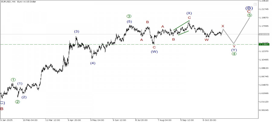 В долгосрочной перспективе по валюте EUR/USD может строится крупная бычья коррекция (B), которая принимает форму стандартного зигзага A-B-C. На сегодняшний день полностью завершены только первые две его части - импульс A и коррекция B.На последнем участке графика мы можем наблюдать развитие бычьей волны C, которая, по всей видимости, принимает форму импульса. На текущий момент завершены первые три его части - подволны [1]-[2]-[3]. В процессе построения сложная коррекционная волна [4].Коррекционная волна [4], по всей видимости, принимает форму двойной тройки (W)-(X)-(Y). Действующая волна (W) и волна связка (X) завершены в форме стандартных зигзагов. Сейчас может формироваться финальная волна (Y), которая примет форму двойного зигзага W-X-Y. Предполагается, что завершение финальной двойного зигзага мы увидим в районе предыдущего минимума, который был отмечен первой действующей волной (W), то есть имеет ввиду уровень 1.138. В текущей ситуации можно рассматривать открытие коротких позиций. Торговые рекомендации: Sell 1.161, takeprofit 1.138.Материал предоставлен компанией InstaForex - www.instaforex.com