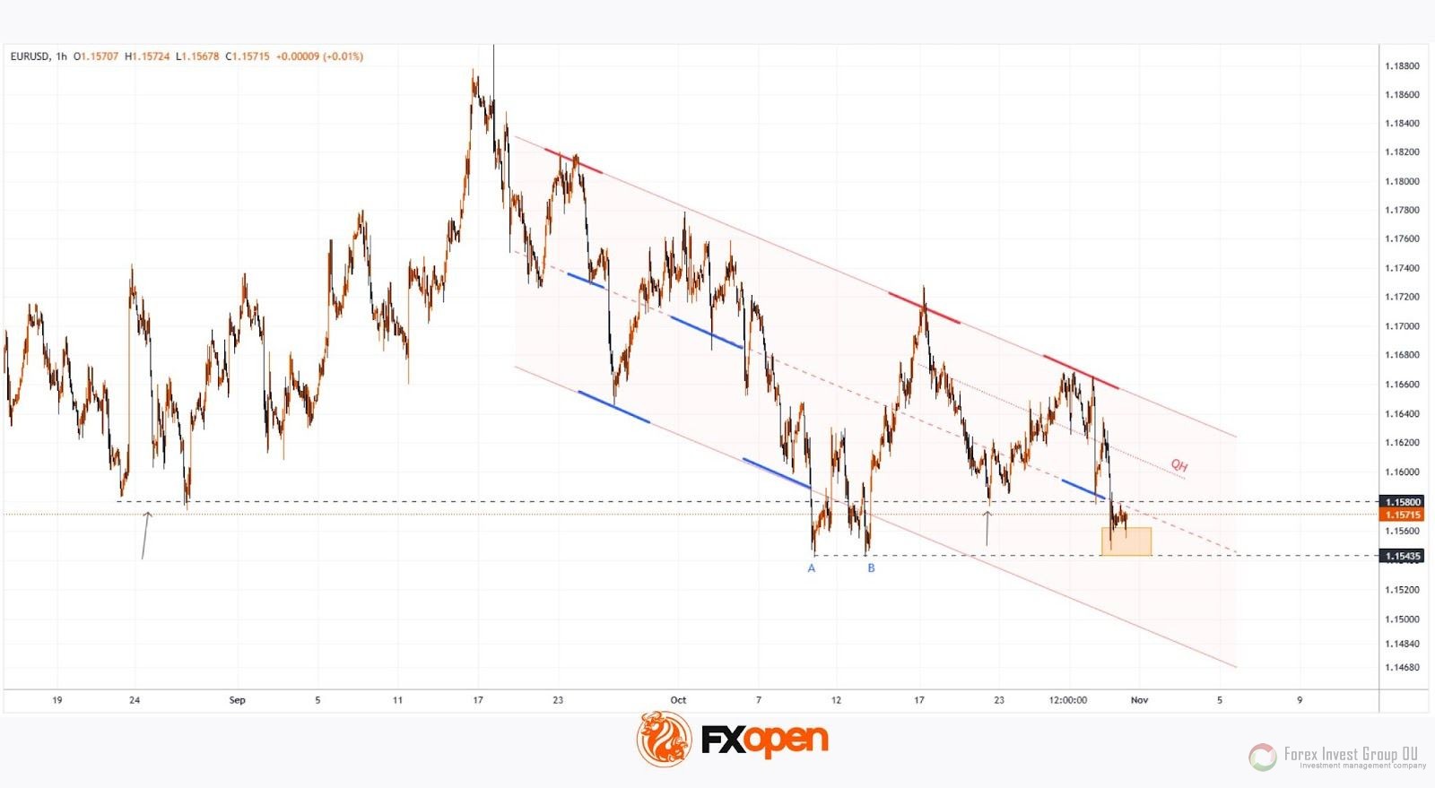 С середины сентября колебания цены образуют нисходящий канал (показан красным цветом). При этом сегодня цена опустилась ниже важного уровня 1.15800, который ранее работал как поддержка (показано стрелками).