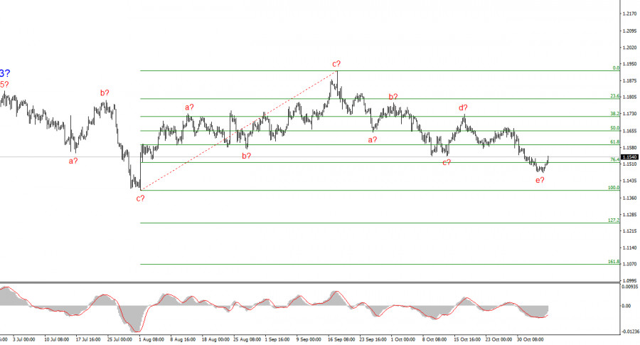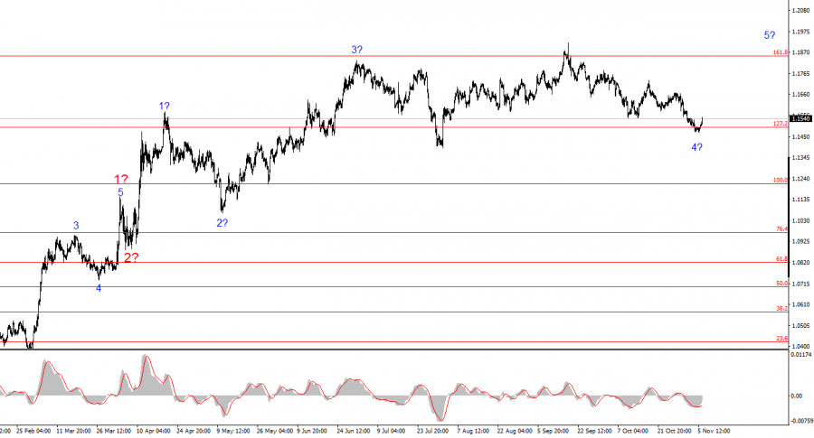 Волновая разметка 4-часового графика для инструмента EUR/USD преобразилась и, к сожалению, не в лучшую сторону. Пока еще рано делать выводы об отмене повышательного участка тренда, но последнее снижение европейской валюты привело к необходимости уточнения волновой разметки. Итак, теперь мы видим серию коррекционных структур. Можно предположить, что они являются составной частью глобальной волны 4 повышательного участка тренда. В этом случае волна 4 приняла неестественно протяженный вид, но в целом волновая разметка сохраняет свою целостность. Построение повышательного участка тренда продолжается, а новостной фон продолжает поддерживать по большей части не доллар. Торговая война, начатая Дональдом Трампом, продолжается. Противостояние президента с ФРС продолжается. «Голубиные» ожидания рынка по ставке ФРС остаются высокими, особенно на 2026 год. В Америке продолжается «шатдаун». Рынок труда «охлаждается». Я считаю, что последнее укрепление доллара – это в некоторой степени парадокс. Но на рынках случаются парадоксы. На мой взгляд, построение повышательного участка тренда не завершено, а его цели разбросаны вплоть до 25-й фигуры. Исходя из этого, европейская валюта может снижаться еще некоторое время, не имея для этого веских оснований(как в последний месяц), но волновая разметка все равно предполагает повышательный участок тренда.