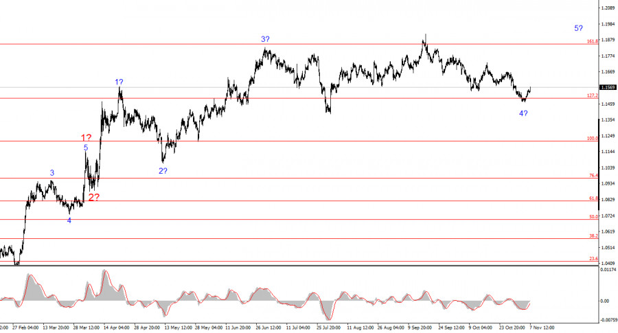 Волновая разметка 4-часового графика для инструмента EUR/USD преобразилась и, к сожалению, не в лучшую сторону. Пока еще рано делать выводы об отмене повышательного участка тренда, но последнее снижение европейской валюты привело к необходимости уточнения волновой разметки. Итак, теперь мы видим серию коррекционных структур. Можно предположить, что они являются составной частью глобальной волны 4 повышательного участка тренда. В этом случае волна 4 приняла неестественно протяженный вид, но в целом волновая разметка сохраняет свою целостность. Построение повышательного участка тренда продолжается, а новостной фон продолжает поддерживать по большей части не доллар. Торговая война, начатая Дональдом Трампом, продолжается. Противостояние президента с ФРС продолжается. «Голубиные» ожидания рынка по ставке ФРС остаются высокими, особенно на 2026 год. В Америке продолжается «шатдаун». Рынок труда «охлаждается». Я считаю, что последнее укрепление доллара – это в некоторой степени парадокс. Но на рынках случаются парадоксы. На мой взгляд, построение повышательного участка тренда не завершено, а его цели разбросаны вплоть до 25-й фигуры. Последней мы увидели пятиволновую коррекционную структуру, поэтому я в любом случае ожидаю теперь повышения инструмента в рамках восходящего набора волн.