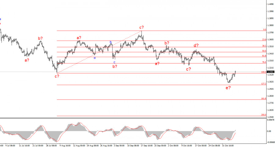 Курс инструмента GBP/USD в течение текущей недели сначала снижался, затем повышался, в точности повторив движения инструмента EUR/USD. Однако, если не рассматривать стандартные отчеты, новостной фон для евро и фунта довольно сильно отличался друг от друга. Во вторник Канцлер Великобритании Рейчел Ривз вызвала бегство участников рынка из британского фунта, заявив, что повышение налогов – неизбежно. Безусловно, никого не может порадовать повышение налогов, а в Британии оно необходимо, чтобы сверстать профицитный бюджет на 2026 год. Проще говоря, расходы британского правительства превышают доходы. Если дефицит бюджета покрывать посредством выпуска государственных облигаций, то нагрузка увеличится еще сильнее, так как любой долг нужно обслуживать. Событие выглядит важным для валютного рынка и для британца, но напомню, что это далеко не первое заявление г-жи Ривз о необходимости повысить налоги. В четверг состоялось заседание Банка Англии. Регулятор принял «пограничное» решение сохранить процентную ставку на отметке 4%, что вполне могло вызвать недовольство почитателей британского фунта. Решение сохранить ставку было принято с минимальным перевесом условных «ястребов» – 5 против 4. Рынок же рассчитывал на гораздо более однозначное мнение от Комитета MPC в пользу сохранения ставки. Напомню, что ключевой проблемой Банка Англии является высокая инфляция – 3,8% в годовом исчислении. Индекс потребительских цен не позволял ожидать снижения ставки, но, как видим, практически половина Комитета MPC не поддержала данное мнение. В сопроводительном заявлении говорилось о том, что уровень безработицы продолжит расти до 5,1%. И, вероятно, именно этим было вызвано желание четырех управляющих провести еще один раунд смягчения денежно-кредитной политики в ноябре. Так или иначе, но после этого «голубиного» события спрос на британца вырос, что тоже не слишком закономерно. Я считаю, что волновая разметка(хоть и нестандартная) гораздо лучше сейчас отвечает на вопрос, чего ожидать дальше.Обратите внимание на другие мои статьи: