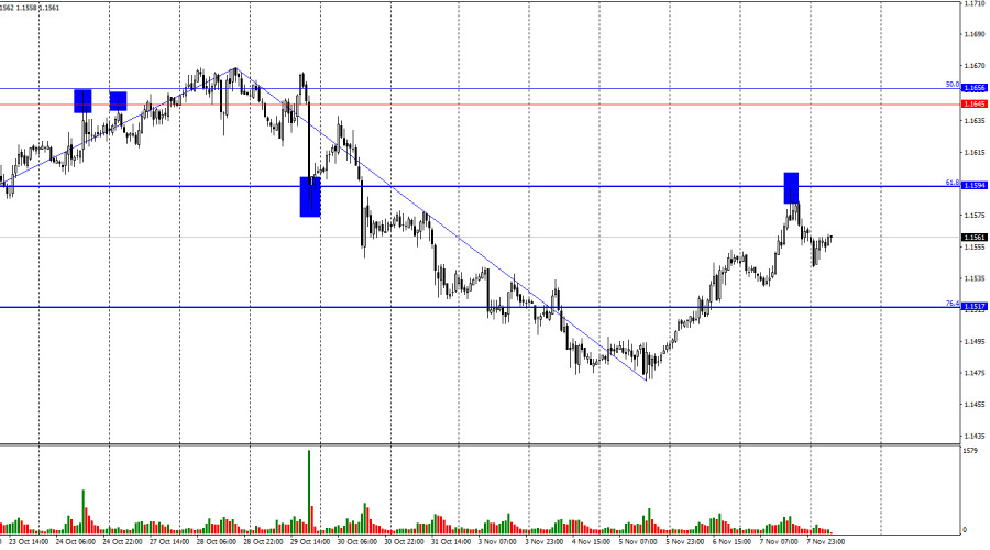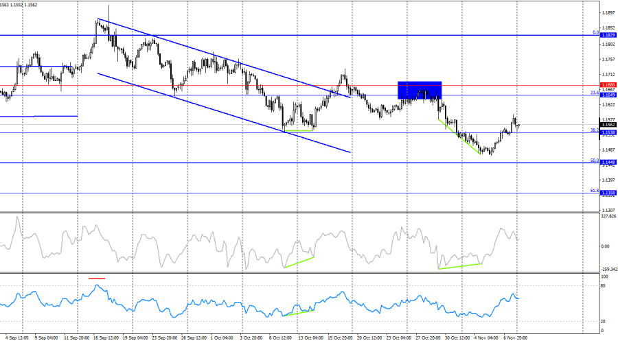 Ситуация с волнами на часовом графике остается простой и понятной. Последняя волна вверх пока не пробила пик предыдущей волны, а последняя волна вниз пробила предыдущий лоу. Таким образом, в данное время тренд остается «медвежьим». Трейдеры-быки не пользуются предоставленными возможностями для наступления, а медведи атакуют зачастую на голом энтузиазме, не имея информационной поддержки. Чтобы текущий тренд признать завершенным, нужен рост пары выше уровня 1,1656 или две «бычьих» волны подряд. В пятницу трейдеры могли обратить свое внимание только на индекс настроения потребителей от Мичиганского университета, но об этом индексе уже можно забыть. Сегодня утром стало известно, что сенаторы США пришли к соглашению в рамках голосования о законопроекте о финансировании. Таким образом, «шатдаун» в США может завершиться в ближайшие дни, о чем уже сообщил Дональд Трамп. Текущий «шатдаун» стал самым длительным в истории США, продолжавшись 40 дней. В данное время неизвестно, кто уступил, демократы или республиканцы, однако сообщается, что финансирование правительства одобрено обеими партиями лишь до 30 января, а в декабре состоится голосование о медицинском обслуживании, на сохранении которого в прежних объемах настаивали демократы. Поэтому, похоже, уступить пришлось республиканцам, так как они настаивали на первоначальном варианте бюджета без каких-либо уступок в сферах медицинского обслуживания и социальной помощи. Так или иначе, но сделка подписана лишь до конца января, поэтому уже в феврале мы можем увидеть новый «шатдаун».