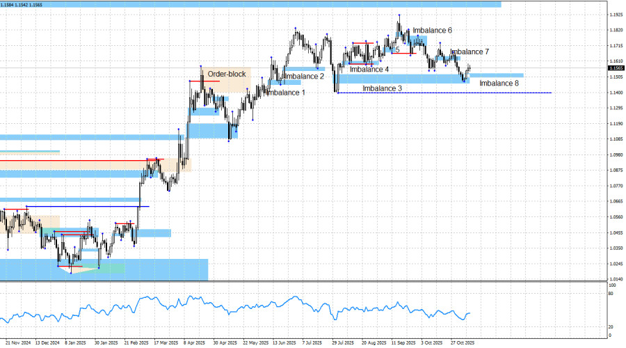 На прошлой неделе пара получила реакцию от имбаланса 3, а трейдеры имели возможность и основания для открытия сделок на покупку. Теперь нужно, чтобы это движение на затухло. В конце прошлой недели образовался новый «бычий» имбаланс 8 практически на том же самом месте, что и отработанный имбаланс 3. Таким образом, имбаланс 8 теперь выступает зоной поддержки для цены, а также зоной интереса трейдеров. Возврат котировок в эту зону и еще одна реакция быков подтвердят мои ожидания в пользу дальнейшего роста пары, и будут соответствовать текущей графической картине. Поэтому в текущих обстоятельствах я допускаю максимум небольшой коррекционный откат, чтобы цена могла отбалансировать себя в имбалансе 8. Информационный фон в понедельник был достаточно интересным, но трейдеров практически не заинтересовал. Ночью Дональд Трамп объявил о завершении «шатдауна» в ближайшем будущем, так как последнее голосование в Сенате набрало необходимые 60 голосов для одобрения закона о финансировании. Однако сенаторы одобрили не полноценный проект финансирования, а лишь временное продление до 30 января. Да и Нижняя палата Конгресса еще не голосовала за этот законопроект. «Шатдаун» еще не завершен, а в ближайшие несколько месяцев демократам и республиканцам предстоят новые переговоры, чтобы избежать новой остановки правительства в начале следующего года. На мой взгляд, позитивных новостей для доллара в понедельник больше не стало. Причин у быков начать новое наступление имеется в достатке уже больше месяца, и все они сохраняют свою актуальность. Это и «голубиные» (в любом случае) перспективы ДКП FOMC, это и общая политика Дональда Трампа (которая не поменялась за последнее время), это и противостояние США с Китаем (где наступило лишь временное перемирие), это и акции протеста против Трампа (захлестнувшие Америку уже три раза в текущем году), это и слабость рынка труда, это и не радужные перспективы американской экономики (рецессия), это и «шатдаун» (который длится уже больше месяца и пока еще не завершен). Таким образом, дальнейший рост пары, на мой взгляд, будет полностью закономерным. Не следует также упускать из виду торговую войну Трампа и его давление на FOMC. В данное время Трамп активно требует от Китая и Индии отказа от российской нефти в рамках компании по завершению войны в Украине. Против Индии Трамп уже повысил пошлины до 50%, а с Китаем вроде бы достигнуты некоторые договоренности, но всего лишь на один год. Новая эскалация – это вопрос времени. Вряд ли такой информационный плацдарм способствует «медвежьему» тренду. В «медвежий» тренд я по-прежнему не верю, но! В него придется поверить через 200 пипсов, если медведя возобновят свои атаки. Информационный фон по-прежнему крайне сложно интерпретировать в пользу доллара, поэтому я и не пытаюсь это делать. Синяя линия показывает ценовой уровень, ниже которого можно будет считать «бычий» тренд завершенным. До него медведям нужно пройти вниз еще около 170 пипсов. Ближайшей целью для роста европейской валюты остается «медвежий» имбаланс 1,1976 – 1,2092 на недельном графике, который был образован еще в июне 2021 года. Но сейчас быкам нужно переживать не об этой цели, а о сохранении своих амбиций. Календарь новостей для США и Евросоюза: Евросоюз – Выступление президента ЕЦБ Кристин Лагард (08-20 UTC). Евросоюз – Индекс 