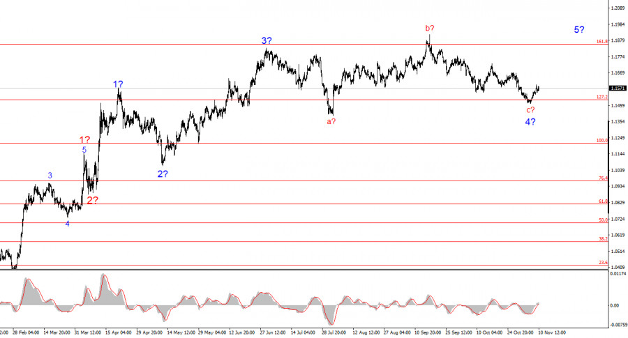 Волновая разметка 4-часового графика для инструмента EUR/USD преобразилась и, к сожалению, не в лучшую сторону. Об отмене повышательного участка тренда, который берет свое начало в январе 2025 года, речи сейчас не идет, но волновая разметка, начиная с 1 июля значительно усложнилась и приняла более протяженный вид. На мой взгляд, инструмент находится в стадии построения коррекционной волны 4, которая приняла нестандартный вид. Однако последняя пятиволновая коррекционная структура наводит на мысль о завершении снижения инструмента на текущем этапе. Построение повышательного участка тренда продолжается, а новостной фон продолжает поддерживать по большей части не доллар. Торговая война, начатая Дональдом Трампом, продолжается. Противостояние президента с ФРС продолжается. «Голубиные» ожидания рынка по ставке ФРС остаются высокими, особенно на 2026 год. В Америке продолжается «шатдаун». Рынок труда «охлаждается». Я считаю, что последнее укрепление доллара – это в некоторой степени парадокс. Но на рынках случаются парадоксы. На мой взгляд, построение повышательного участка тренда не завершено, а его цели разбросаны вплоть до 25-й фигуры. Серия волн a-b-c-d-e выглядит завершенно, следовательно, я в любом случае ожидаю повышения инструмента с текущих позиций.