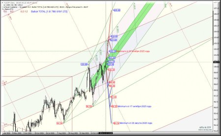 Операционный масштаб Minor (таймфрейм Daily)AUD/JPY - Daily - обзор вариантов движения с 13 ноября 2025 г.Предыдущий обзор Australian Dollar vs Japanese Yen (таймфрейм h4 ) от 06.11.2025 г. 13:57___________________Australian Dollar vs Japanese YenРазвитие движения AUD/JPY-Daily c 13 ноября 2025 будет обусловлено границами зоны равновесия вил (98.90 - 101.20 - 103.60) старшего операционного масштаба Minor-Daily и продолжится с учетом отработки и направления пробоя границ зоны равновесия (100.30 - 100.90 - 101.60) вил младшего операционного масштаба Minute-h4.Восходящее движение.При пробое уровня сопротивления 100.60 на верхней границе ISL61.8 зоны равновесия вил младшего операционного масштаба Minute-h4 и maximum 102.34 от 07 ноября 2025 года восходящее движение этой валютной пары может иметь продолжение к верхней границе ISL61l.8 (103.60) зоны равновесия вил старшего операционного масштаба Minor-Daily и к конечной линии FSL Minute-h4 (104.00).Нисходящее движение.В случае пробоя уровня поддержки 100.30 на нижней границе ISL38.2 зоны равновесия вил младшего операционного масштаба Minute-h4 станет актуальным продолжение развития нисходящего движения Australian Dollar vs Japanese Yen к нижней границе ISL38.2 (98.90) зоны равновесия вил старшего операционного масштаба Minor-Daily и к начальной линии SSL Minute-h4 (98.50) с перспективой достижения AUD/JPY контрольной линии LTL Minute-h4 (97.25) и minimum 96.20 от 17 октября 2025 года.___________________Обзор составлен без учета новостного фона, открытия торговых сессий основных финансовых центров и не является руководством к действию (выставления ордеров "sell" или "buy").Формула расчета индекса доллара: