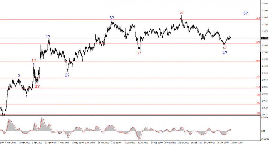 Волновая разметка 4-часового графика для инструмента EUR/USD преобразилась и, к сожалению, не в лучшую сторону. Об отмене повышательного участка тренда, который берет свое начало в январе 2025 года, речи сейчас не идет, но волновая разметка, начиная с 1 июля значительно усложнилась и приняла более протяженный вид. На мой взгляд, инструмент находится в стадии построения коррекционной волны 4, которая приняла нестандартный вид. Однако последняя пятиволновая коррекционная структура наводит на мысль о завершении снижения инструмента на текущем этапе. Построение повышательного участка тренда продолжается, а новостной фон продолжает поддерживать по большей части не доллар. Торговая война, начатая Дональдом Трампом, продолжается. Противостояние президента с ФРС продолжается. «Голубиные» ожидания рынка по ставке ФРС остаются высокими, особенно на 2026 год. В Америке продолжается «шатдаун». Рынок труда «охлаждается». Я считаю, что последнее укрепление доллара – это в некоторой степени парадокс. Но на рынках случаются парадоксы. На мой взгляд, построение повышательного участка тренда не завершено, а его цели разбросаны вплоть до 25-й фигуры. Серия волн a-b-c-d-e выглядит завершенно, следовательно, я в любом случае ожидаю повышения инструмента с текущих позиций.