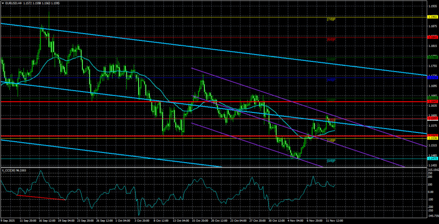 Валютная пара EUR/USD в течение среды продолжала торговаться в крайне спокойном режиме. В течение дня вновь ни одного важного сообщения в распоряжение трейдеров не поступало, поэтому реагировать в течение дня было не на что. Однако в те дни, когда важные сообщения поступали, рынок тоже не спешил активно открывать позиции. Таким образом, если волатильность находится на «нуле», когда у рынка имеется «пища для размышлений», то чего уж ожидать от дней, когда макроэкономический и фундаментальный фон отсутствуют? С нашей точки зрения(мы об этом говорим практически каждый день и продолжим говорить), основным моментом в данное время является флэт на дневном ТФ. Именно он объясняет слабую волатильность, алогичные локальные движения, полную незаинтересованность рынка в информации. Напомним только, что за последние два месяца ФРС дважды понизила ключевую ставку, а последние полтора месяца в Америке не работают практически все государственные службы и правительство. И такие новости абсолютно никакого давления на доллар США не оказали. Американская валюта продолжает расти. Она растет медленно, с постоянными откатами вверх, что указывает на коррекционный статус нисходящего движения. Таким образом, любое падение пары – это априори коррекция. Глобальный восходящий тренд 2025 года сохраняется. Флэт в области 1,1400-1,1830 на дневном ТФ остается актуальным. Чего тогда можно ожидать дальше? Совершенно точно не логичных движений. Мы считаем, что в области нижней линии бокового канала произойдет разворот наверх, после чего восходящий тренд возобновится. И тогда уже для нового роста пары совершенно не будут нужны локальные макроэкономические и фундаментальные факторы. Евро будет расти, а эксперты будут недоумевать, почему растет евро. Напомним, что, строго говоря, это не евровалюта показала рост в 2025 году. Это доллар показал падение. У Евросоюза самого крайне мало позитивных новостей для европейской валюты. Экономика растет по-прежнему достаточно слабо, промышленное производство регулярно сокращается уже несколько лет подряд, торговые пошлины Трампа бьют по европейским экспортерам, а ЕЦБ восемь раз понизил ключевую ставку. Таким образом, если бы не Дональд Трамп, который в январе-месяце во второй раз стал президентом США, то, скорее всего, европейская валюта продолжала бы падать так, как она падала 17 лет до этого. В конце прошло года мы всерьез считали, что европейская валюта опустится ниже ценового паритета с долларом. Однако пришел Трамп и все исправил. Падение доллара в долгосрочной перспективе можно ожидать хотя бы потому, что самому Трампу нужен дешевый доллар, о чем он неоднократно заявлял еще 8 лет назад. Остается только дождаться, когда рынок выйдет из состояния анабиоза, а флэт на дневном ТФ завершится. Средняя волатильность валютной пары EUR/USD за последние 5 торговых дней по состоянию на 13 ноября составляет 52 пункта и характеризуется, как «низкая». Мы ожидаем движение пары между уровнями 1,1543 и 1,1647 в четверг. Старший канал линейной регрессии направлен вниз, сигнализируя о нисходящей тенденции, но по факту продолжается флэт на дневном ТФ. Индикатор CCI заходил в октябре в область перепроданности дважды(!!!), что может спровоцировать новый виток восходящего тренда 2025 года. Ближайшие уровни поддержки: S1 – 1,1536 S2 – 1,1475 S3 – 1,1414 Ближайшие уровни сопро