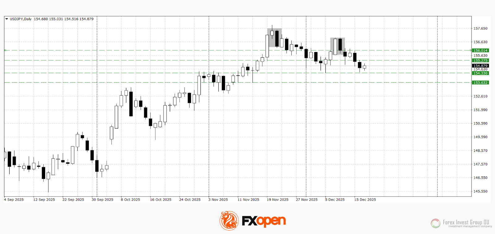 В паре USD/JPY сохраняется нисходящее давление после формирования медвежьих комбинаций “поглощение” и “тёмные облака” на дневном таймфрейме. Тем не менее на данный момент продавцы пары столкнулись с важным диапазоном 154.00 - 154.40, который ранее неоднократно выступал как зоной поддержки, так и сопротивления. Повторный отбой от указанного диапазона может способствовать коррекционному росту в направлении 155.30 - 156.00. Уверенное закрепление ниже 154.00 может усилить нисходящий тренд.