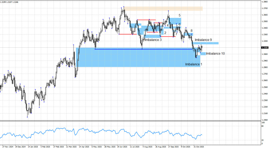 В пятницу информационный фон отсутствовал, но в первые четыре дня недели новостей было достаточно. Только в Великобритании вышли важные отчеты по безработице, ВВП и промышленному производству, и все три – оказались слабее ожиданий трейдеров. Также в США завершился (на какое-то время) «шатдаун», и в итоге трейдеры имели целых четыре важных новости, все четыре – указывали на рост доллара, и всю неделю рос британский фунт. Таким образом, я продолжаю говорить о том, что информационный фон в 80-90% случаев сейчас игнорируется трейдерами. Если имбаланс 9 будет инвалидирован, процесс роста фунта не просто будет продолжен, я буду считать, что «бычий» тренд возобновлен. В этом случае я ожидаю роста пары к пикам 2025 года. Таким образом, на текущий момент остается надеется, что отработка имбаланса 10 придаст сил быкам, а отработка имбаланса 9 не заставит медведей перейти в новую атаку. Британские отчеты не испортили графическую картину, хотя всеми силами старались это сделать. Но все же быкам нужно сосредоточиться и постараться выполнить закрепление над зоной 1,3215 – 1,3250, что позволит им чувствовать себя далее гораздо более уверенно. В США общий информационный фон остается таковым, что ничего, кроме падения американца, в долгосрочном плане ожидать нельзя. Ситуация в США остается достаточно сложная. «Шатдаун» продолжался полтора месяца, демократы и республиканцы договорились, но это временная договоренность, а не постоянная. Статистики по рынку труда нет, заседание FOMC завершилось принятием «голубиного» решения, трейдеры уверены в дальнейшем смягчении ДКП, хоть «голубиные» настроения внутри самого FOMC становятся слабее (только в отношении декабрьского заседания). На мой взгляд, у быков есть все, чтобы начать новое наступление и выполнить возврат к пикам года. Для «медвежьего» тренда нужен сильный и стабильный для американца позитивный информационный фон, которого нет и не было. Чем ниже проседает курс британской валюты, тем выгоднее быкам открывать новые сделки на покупку. Последнее наступление медведей началось после реакции на «медвежий» ордер-блок, а затем было поддержано тремя имбалансами. Остается и четвертый «медвежий» имбаланс (9), который может создать проблемы «бычьему» тренду, на восстановление которого я все еще рассчитываю. В общем и целом, могу сказать следующее. В «медвежий» тренд по британцу я по-прежнему не верю, несмотря на довольно сильное падение, которое длилось больше месяца. Слишком много факторов риска остается висеть мертвым грузом на долларе. Текущий «бычий» тренд можно считать завершенным, так как котировки выполнили падение ниже двух лоу (от 12 мая и 1 августа). Но за счет чего медведи будут двигать фунт дальше вниз? Именно потому, что я не могу вразумительно ответить на этот вопрос, я не считаю, что процесс падения будет продолжен. Календарь новостей для США и Великобритании: 17 ноября календарь экономических событий не содержит в себе ни одной интересной записи. Влияние информационного фона на настроение рынка в пятницу будет отсутствовать. Прогноз по GBP/USD и советы трейдерам: По британцу картина начинает принимать более приятный вид. Было отработано два «бычьих» паттерна, остается инвалидировать единственный «медвежий», и тогда путь наверх будет открыт. Я не вижу никаких информационных оснований для «медвежьего»