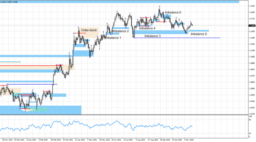Пара получила реакцию от имбаланса 3, и это был очень важный сигнал. Трейдеры получили возможность и основания для открытия сделок на покупку. Чуть позже был образован новый «бычий» имбаланс 8 и теперь этот паттерн теперь выступает зоной поддержки для цены, а также зоной интереса трейдеров. Коррекционного отката мы пока не увидели, но в целом, он и не сильно нужен, так как хорошую разворотную модель и сигнал цена образовала. Информационный фон в понедельник отсутствовал, поэтому рассчитывать на сильные атаки быков или медведей не приходилось. На выходных тоже не случилось ничего интересного или примечательного. Таким образом, в начале новой недели я могу сказать следующее: информационный фон не изменился и вряд ли изменится на этой неделе. Если медведи вновь начнут атаковать, то будут делать это вновь на голом энтузиазме и при полном попустительстве быков. Причин у быков для нового наступления имеется в достатке уже больше месяца, и все они сохраняют свою актуальность. Это и «голубиные» (в любом случае) перспективы ДКП FOMC, это и общая политика Дональда Трампа (которая не поменялась за последнее время), это и противостояние США с Китаем (где наступило лишь временное перемирие), это и акции протеста против Трампа (захлестнувшие Америку уже три раза в текущем году), это и слабость рынка труда, это и не радужные перспективы американской экономики (рецессия), это и «шатдаун» (который длился больше месяца, но явно не был учтен трейдерами). Таким образом, дальнейший рост пары, на мой взгляд, будет полностью закономерным. Не следует также упускать из виду торговую войну Трампа и его давление на FOMC. В данное время Трамп активно требует от Китая и Индии отказа от российской нефти в рамках компании по завершению войны в Украине. Против Индии Трамп повысил пошлины до 50%, а с Китаем вроде бы достигнуты некоторые договоренности, но всего лишь на один год. Новая эскалация – это вопрос времени. Вряд ли такой информационный плацдарм способствует «медвежьему» тренду. В «медвежий» тренд я по-прежнему не верю. Информационный фон по-прежнему крайне сложно интерпретировать в пользу доллара, поэтому я и не пытаюсь это делать. Синяя линия показывает ценовой уровень, ниже которого можно будет считать «бычий» тренд завершенным. До него медведям нужно пройти вниз еще около 240 пипсов. Ближайшей целью для роста европейской валюты остается «медвежий» имбаланс 1,1976 – 1,2092 на недельном графике, который был образован еще в июне 2021 года. Календарь новостей для США и Евросоюза: 18 ноября календарь экономических событий вновь не содержит в себе ни одной интересной записи. Влияние информационного фона на настроение рынка во вторник также будет отсутствовать. Прогноз по EUR/USD и советы трейдерам: На мой взгляд, пара может находиться на завершающем этапе «бычьего» тренда. Несмотря на то, что информационный фон остается на стороне быков, атаковали в последнее время только медведи. И они по-прежнему находятся на грани слома «бычьего» тренда. Но все же реалистичных причин для начала «медвежьего» тренда я сейчас не вижу. От имбалансов 1, 2, 4 и 5 трейдеры имели возможность покупать евровалюту. Во всех случаях мы увидели определенный рост. Возможность открывать новые покупки по тренду появились у трейдеров на прошлой неделе, так как была получена реакция на «бычий» имбаланс 3. Цел