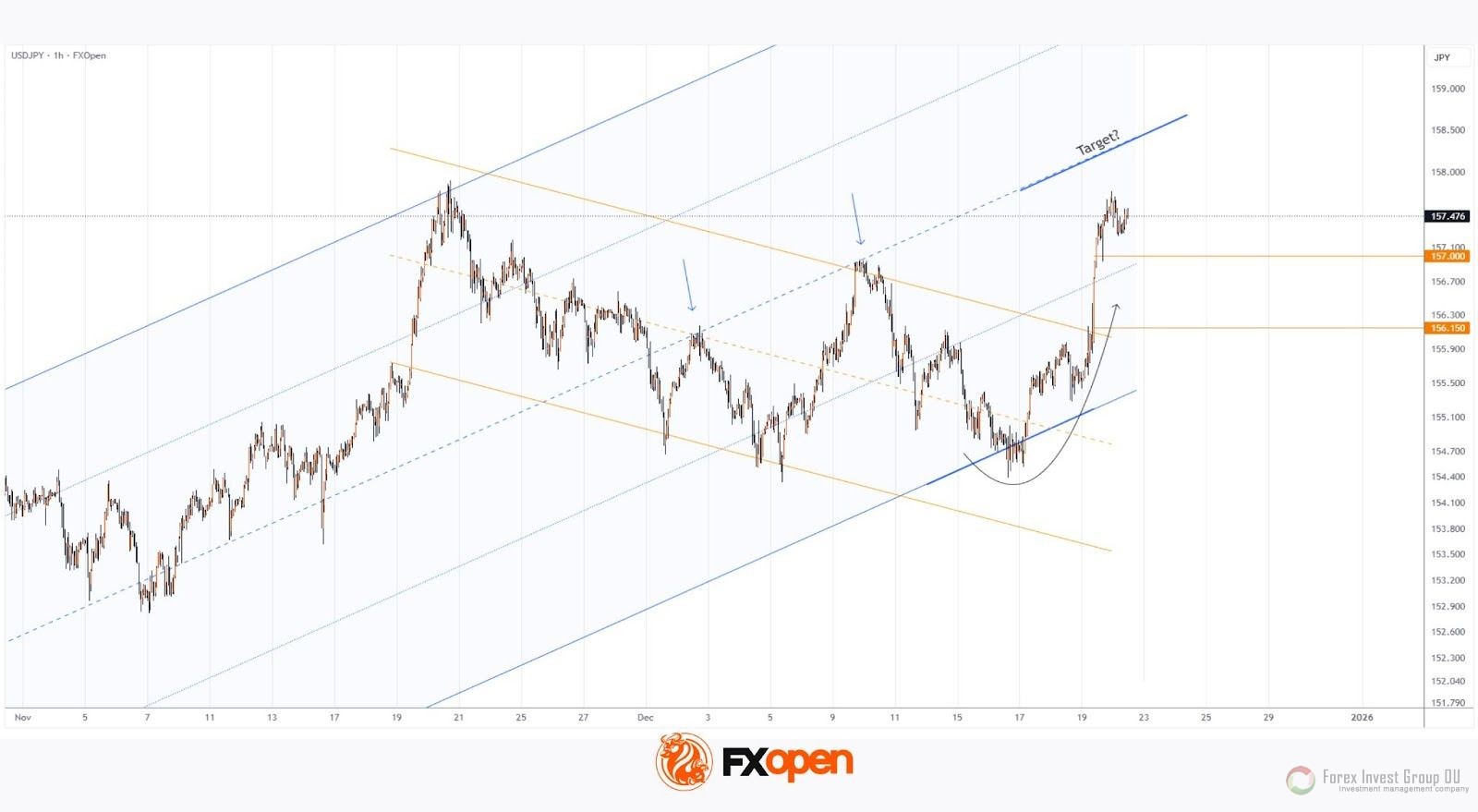 FxSignal 22-12-2025, 16:00 182 Аналитика, прогнозы валютного рынка15 декабря мы обращали внимание, что курс USD/JPY опускается к ключевой поддержке от нижней границы восходящего канала.