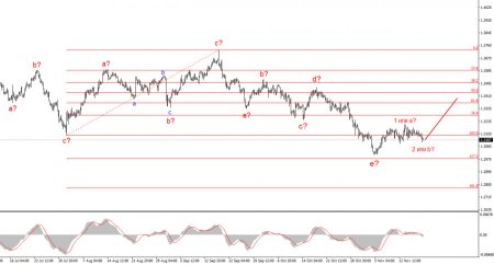 По инструменту GBP/USD волновая разметка продолжает свидетельствовать о построении повышательного участка тренда(картинка снизу), но в последние несколько недель она приняла сложный и протяженный вид(картинка сверху). Участок тренда, берущий свое начало 1 июля, можно считать волной 4. Или же любой глобальной коррекционной волной, так как она имеет коррекционную, а не импульсную внутреннюю волновую структуру. Тоже самое касается и ее внутренних подволн. Поэтому, несмотря на длительное снижение британца, я считаю, что повышательный тренд сохраняется. Понижательная структура волн, берущая начало 17 сентября, приняла пятиволновой вид a-b-c-d-e и может быть завершена. Если это действительно так, то сейчас инструмент находится в самом начале построения нового повышательного набора волн. Безусловно, любая волновая структура в любой момент может усложниться и принять более протяженный вид. Даже предполагаемая волна 4, которая строится уже почти 5 месяцев, может принять пятиволновой вид, а мы в этом случае будем еще несколько месяцев наблюдать коррекцию. Однако в данное время может начать свое построение повышательный набор волн. Если это предположение верно, то его первую волну мы увидели, а вторая волна может завершиться на текущих позициях.